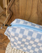 This light blue and white checkered cosmetic pouch combines style and practicality. Its compact size makes it perfect for travel or everyday use, easily fitting into any bag. The secure zipper keeps your essentials safe, while the lined interior protects your items and makes cleaning effortless. A chic and convenient way to organize your beauty essentials wherever you go.