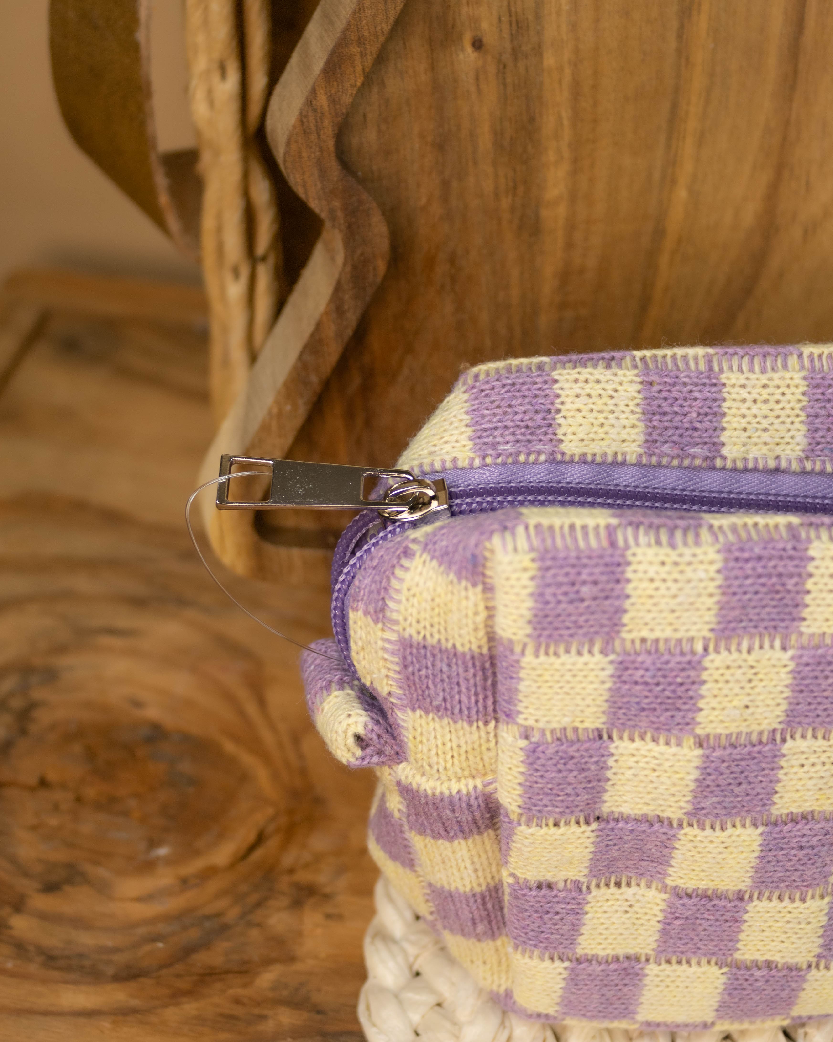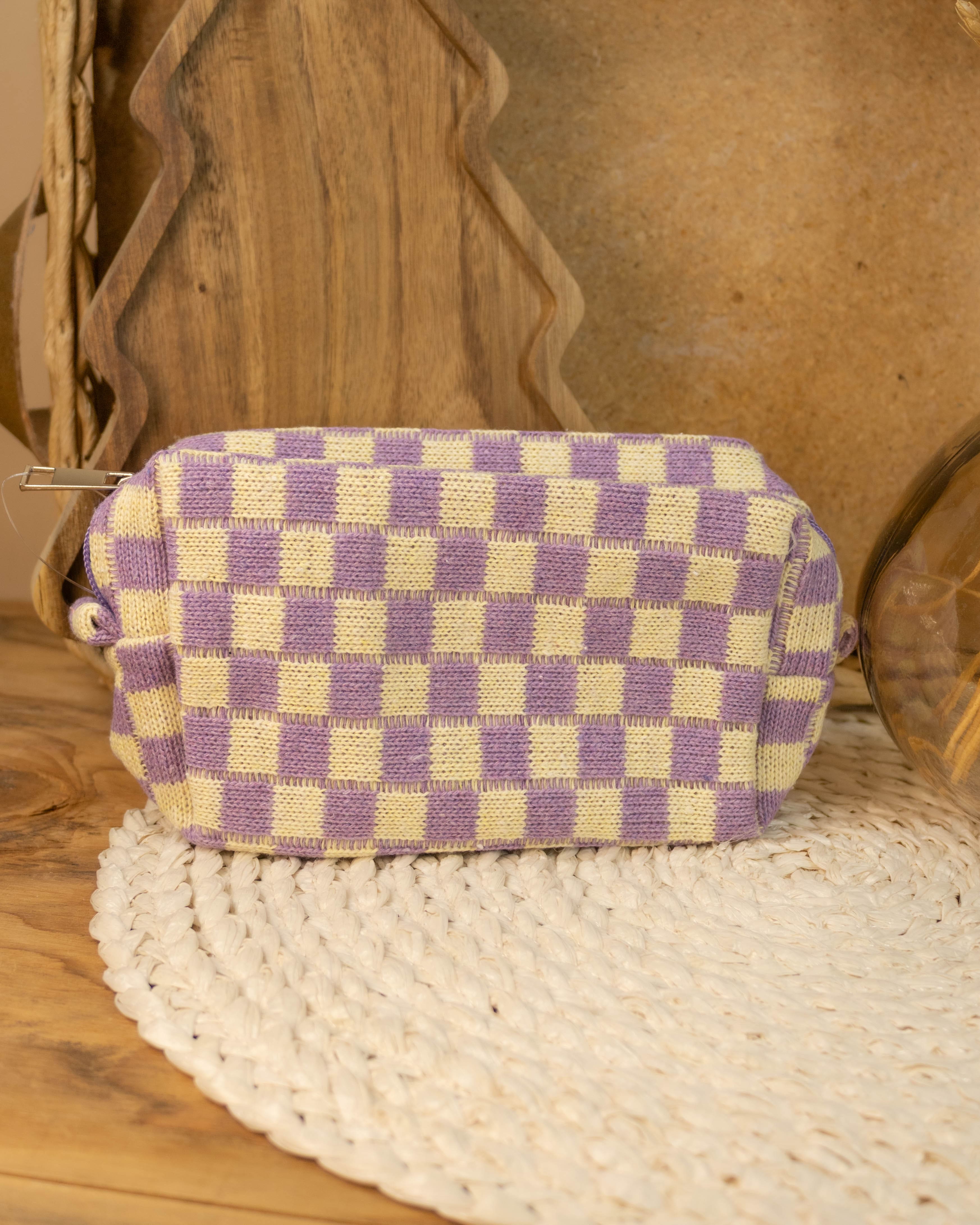 This Lavender and white checkered cosmetic pouch combines style and practicality. Its compact size makes it perfect for travel or everyday use, easily fitting into any bag. The secure zipper keeps your essentials safe, while the lined interior protects your items and makes cleaning effortless. A chic and convenient way to organize your beauty essentials wherever you go.