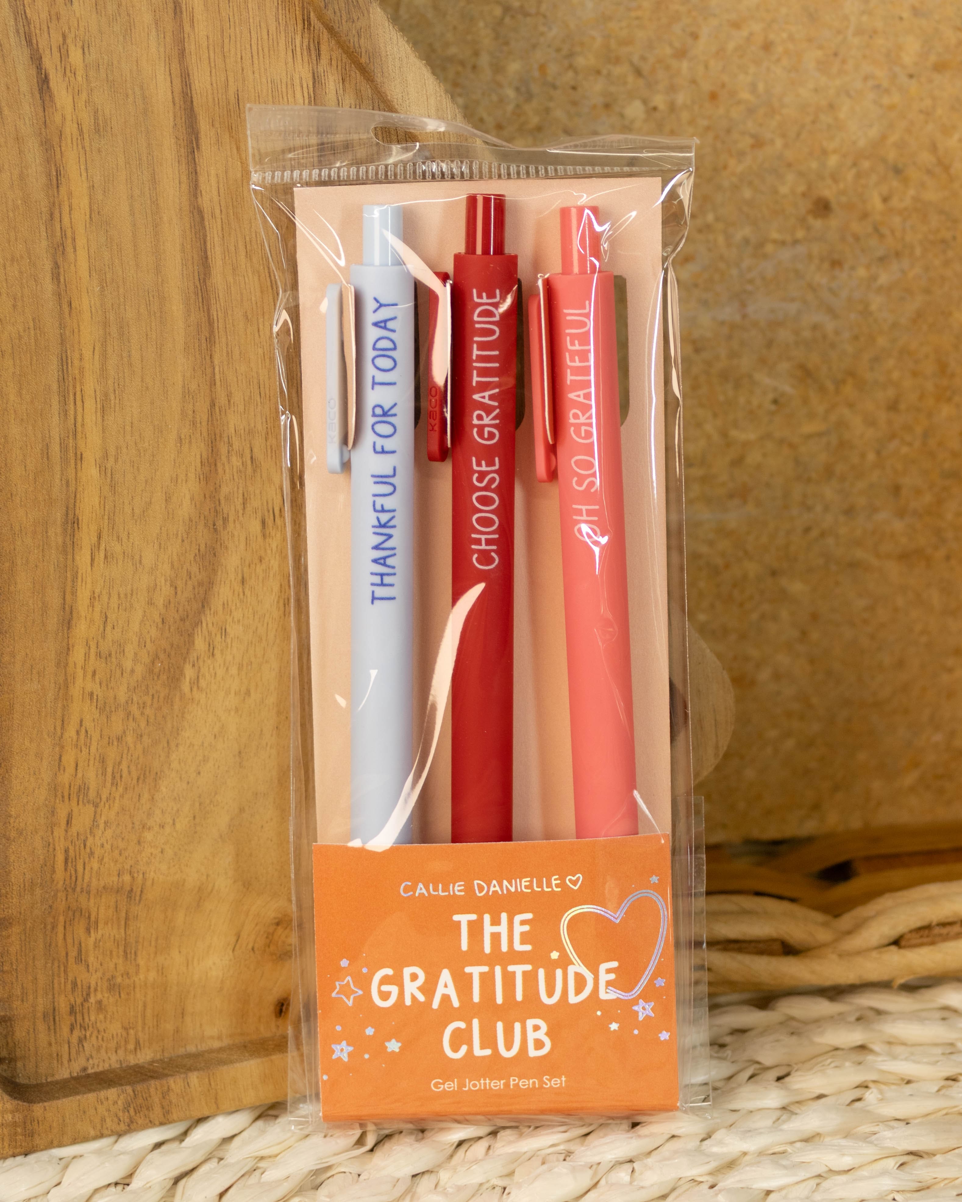 Features: 3 click-style gel ink pens Ink colors: Light Blue, Red, Pink Size: Packaging - 6"×2.25×0.4" Design: Thankful For Today; Choose Gratitude; Oh So Grateful