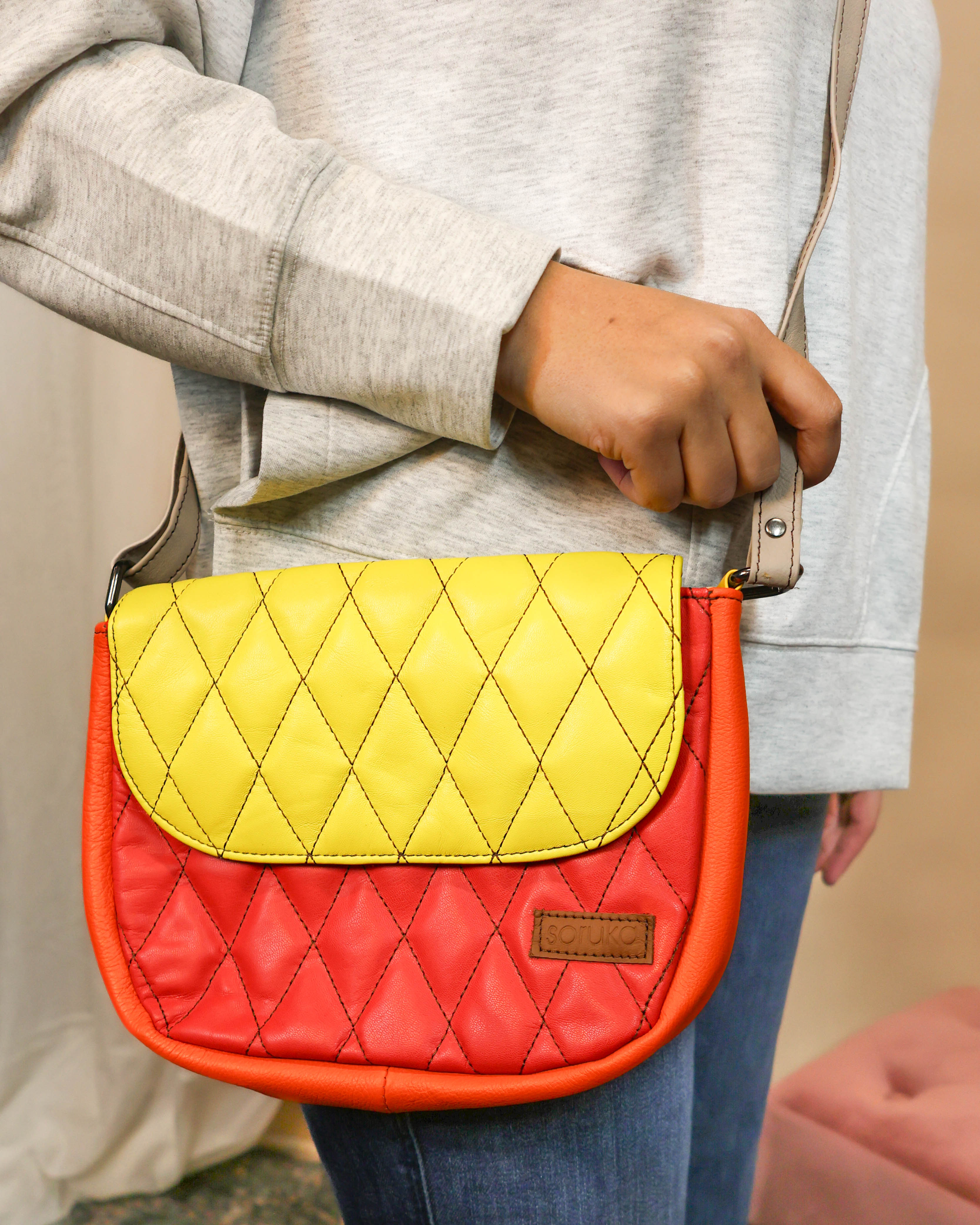 Carry your essentials in style with the Hydra Crossbody Bag, a round beauty that's as fun as it is functional. Crafted from quilted leather with an eye-catching diamond pattern, this bag adds instant personality to any outfit. The secure magnetic clasp keeps your belongings safe while you're on the move, and the crossbody strap leaves your hands free for whatever adventure comes next. Perfect for days when you want a pop of color without sacrificing practicality.