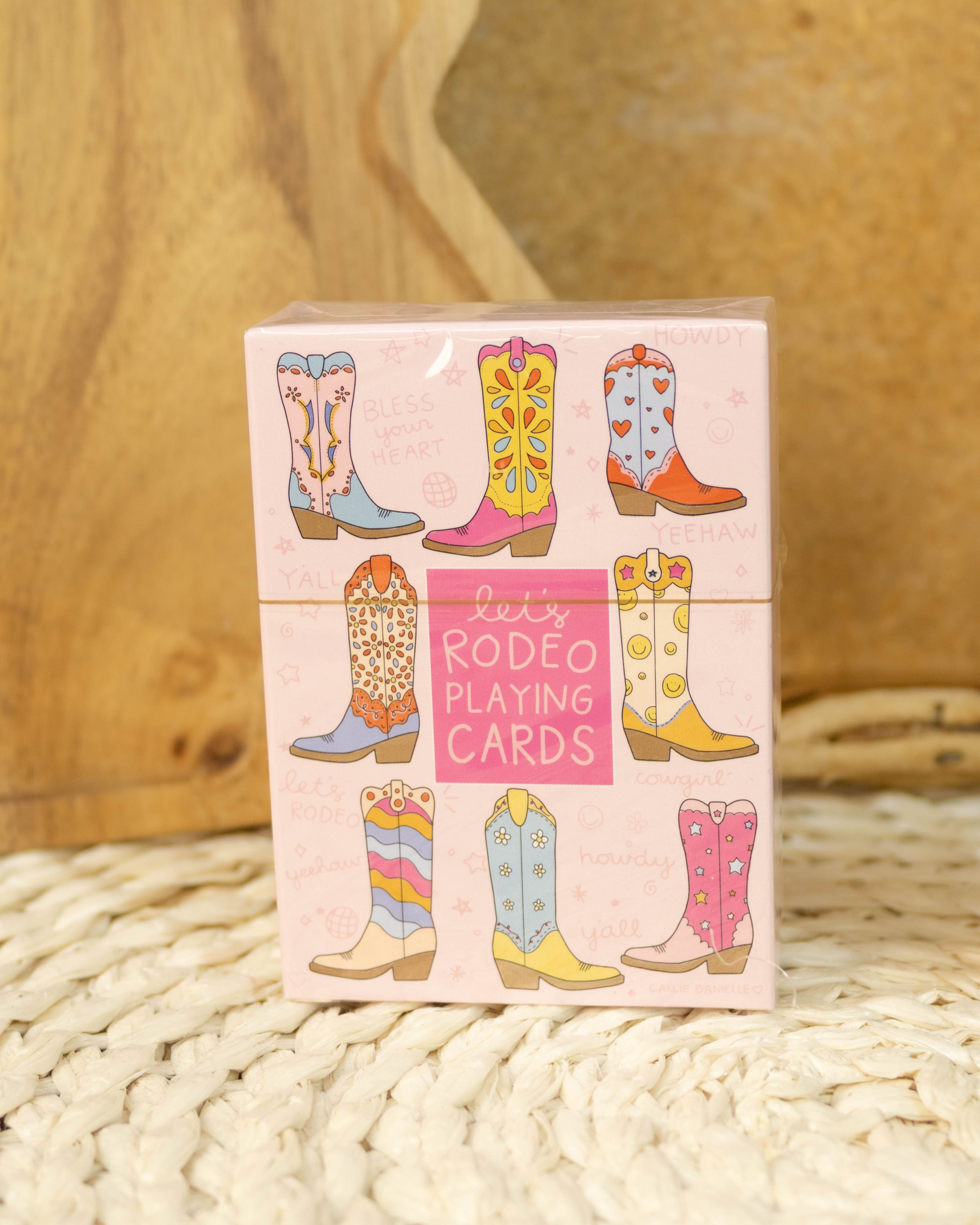 Kick your card games up a notch with our Let's Rodeo Deck of Playing Cards. Each card features hand-drawn CD cowgirl boots, adding a touch of sourthern flair to your game nights. Shuffle, play, and let the good times roll! • Standard 52 card deck • Size: Cards - 2.5" x 3.5"; Box - 3" x 3.6" x 1"