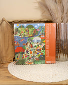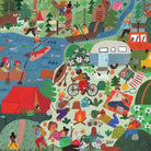 A mountain themed puzzle with bright colors & cute elements! In this busy mountain scene you will find hikers, people around a fire, campers, fishers, wildlife, and more! You will love this mountain puzzle. 1000 piece puzzle Finished puzzle dimensions - 20" x 27" Box dimensions - 9" x 9" x 2" Includes 8x10 colored poster of puzzle