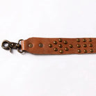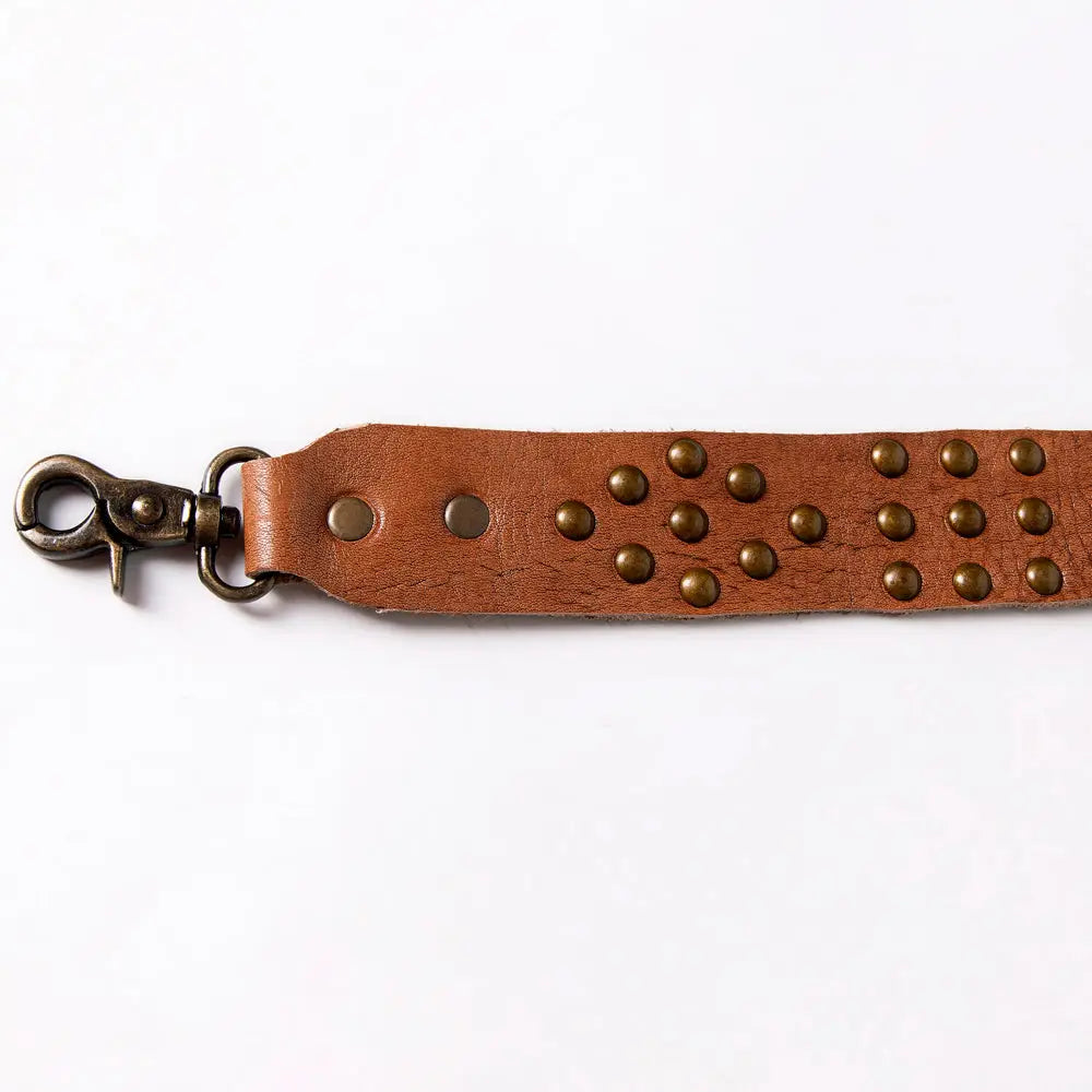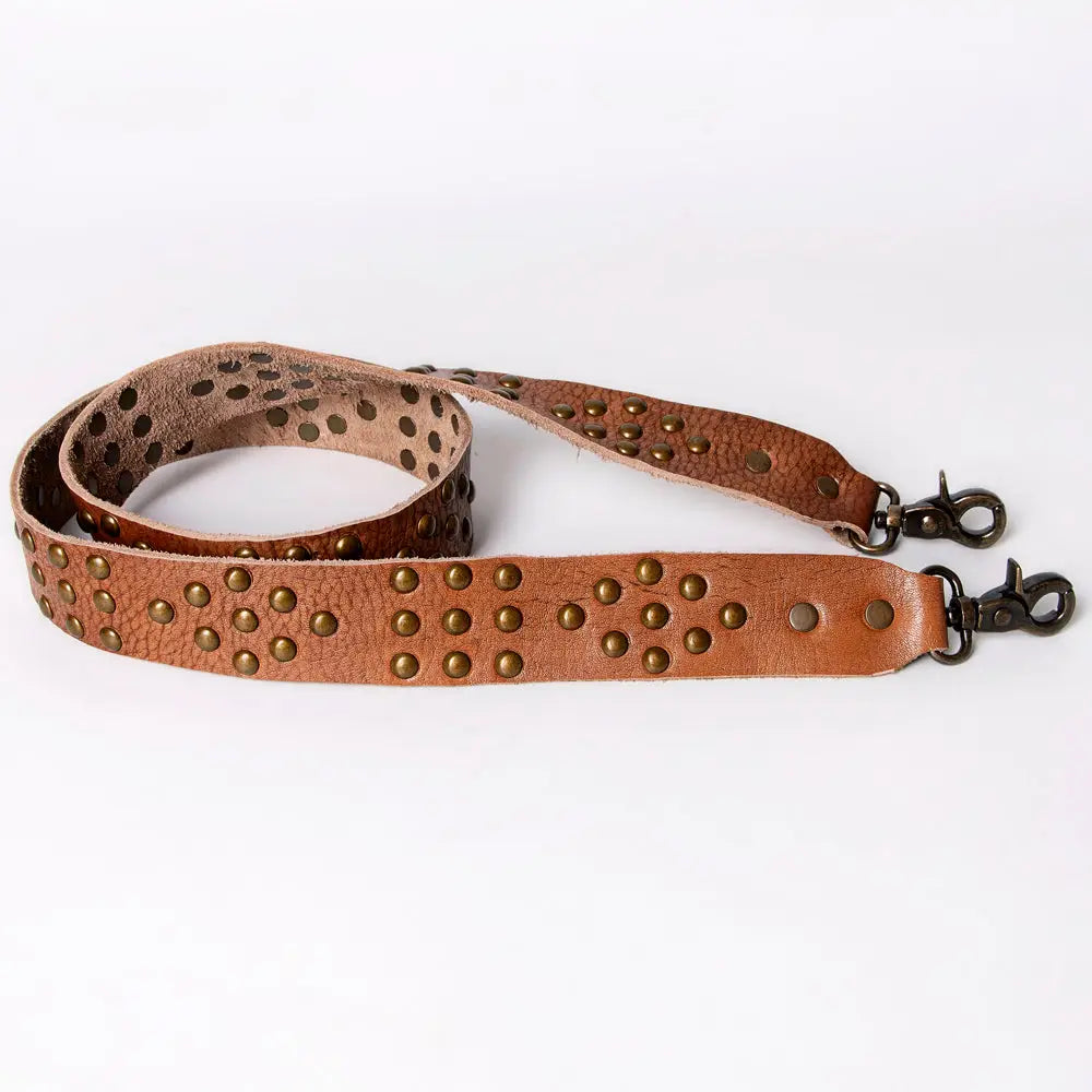 This distressed leather bag strap delivers effortless Western charm and rugged durability. Decorated with antique brass studs in classic cluster patterns, it adds bold personality to any handbag.