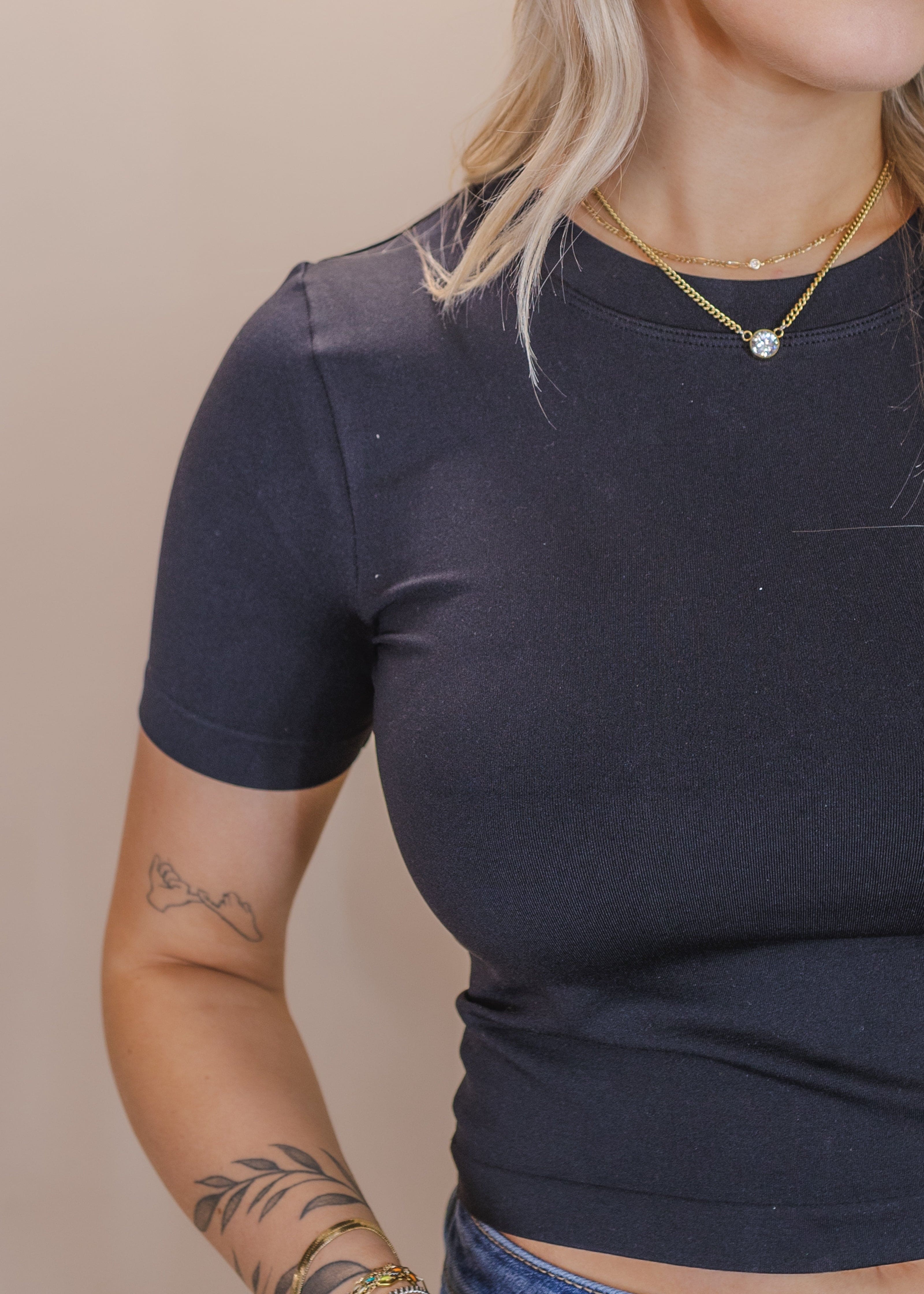 These cropped crew neck tees will be great under tops, rompers, or jumpsuits, worn with high waisted skirts, shorts, etc. They are a great smooth and stretchy material that we LOVE because of how versatile they are and how great they are to layer with. The short sleeves are really nice to hide bra straps and give you a little extra coverage, and the cropped length is just right! The tank version of this was so popular we just had to bring in the tee style!