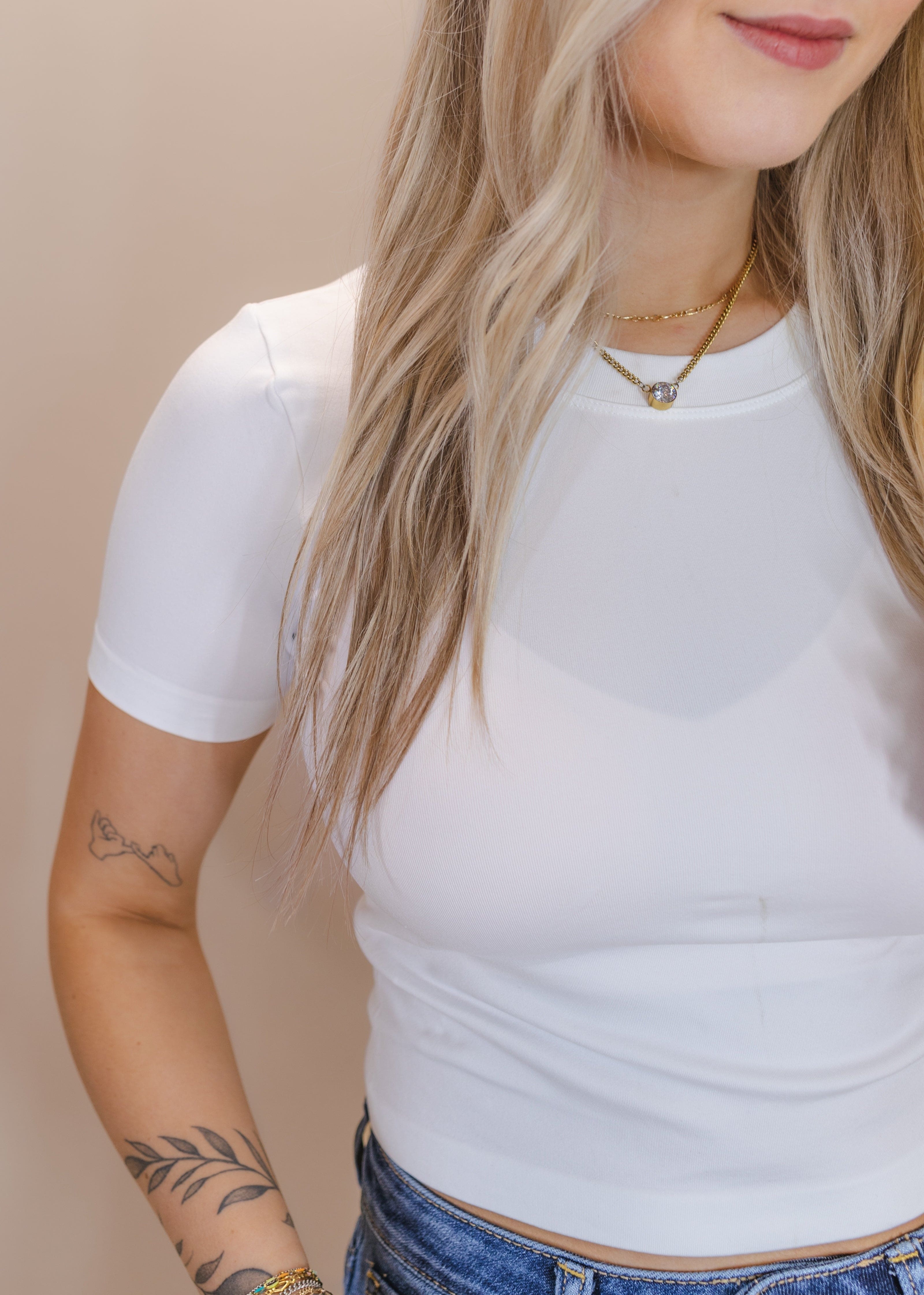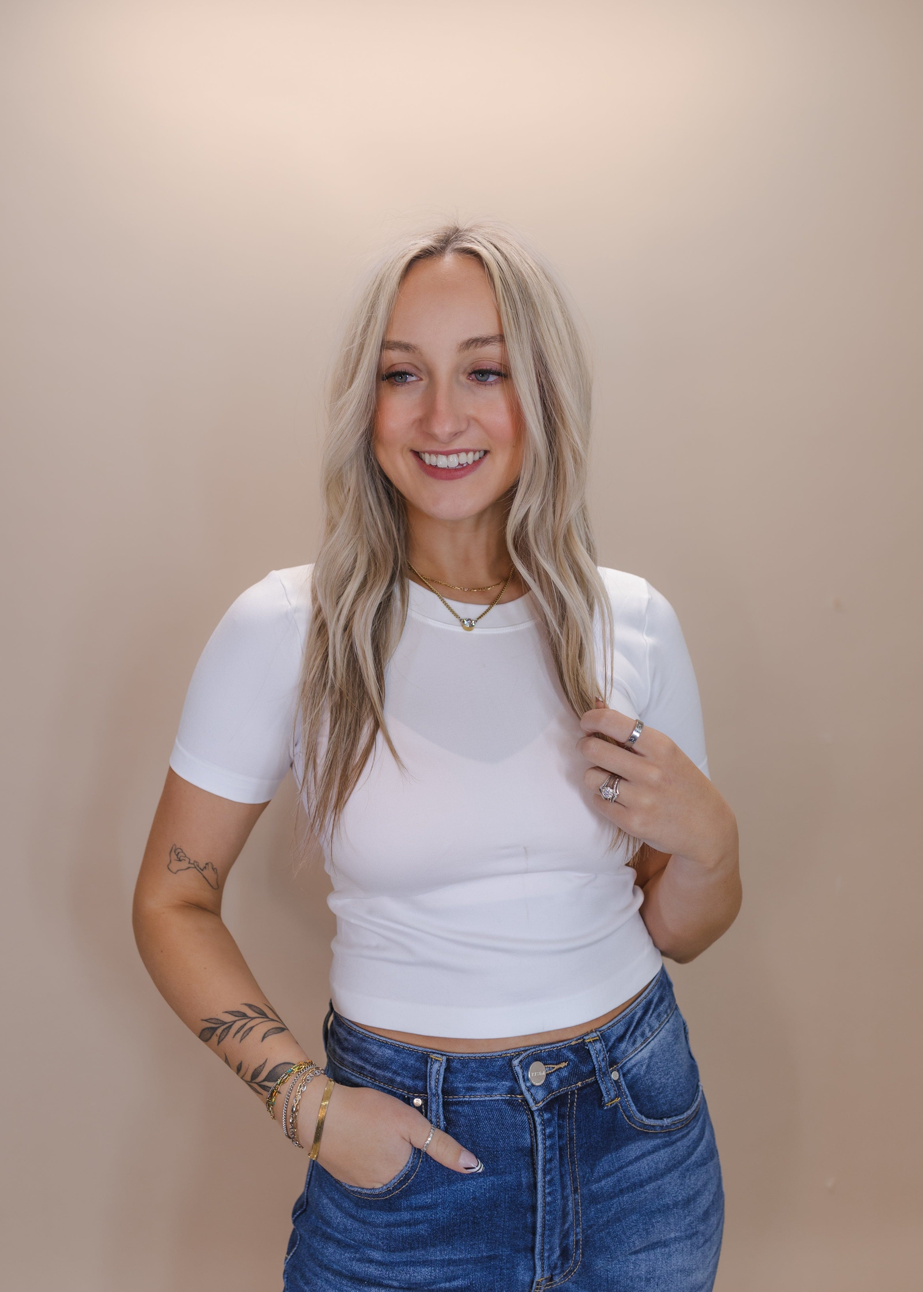 These cropped crew neck tees will be great under tops, rompers, or jumpsuits, worn with high waisted skirts, shorts, etc. They are a great smooth and stretchy material that we LOVE because of how versatile they are and how great they are to layer with. The short sleeves are really nice to hide bra straps and give you a little extra coverage, and the cropped length is just right! The tank version of this was so popular we just had to bring in the tee style!