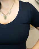 The perfect everyday essential, this classic black V-neck tee delivers effortless style and comfort. Crafted from quality fabric, the short sleeves and flattering V-neckline make it ideal for layering or wearing solo. Whether you're dressing down for casual outings or creating a polished foundation for your wardrobe, this versatile piece transitions seamlessly from day to night. Stock your closet with a wardrobe staple that works as hard as you do.