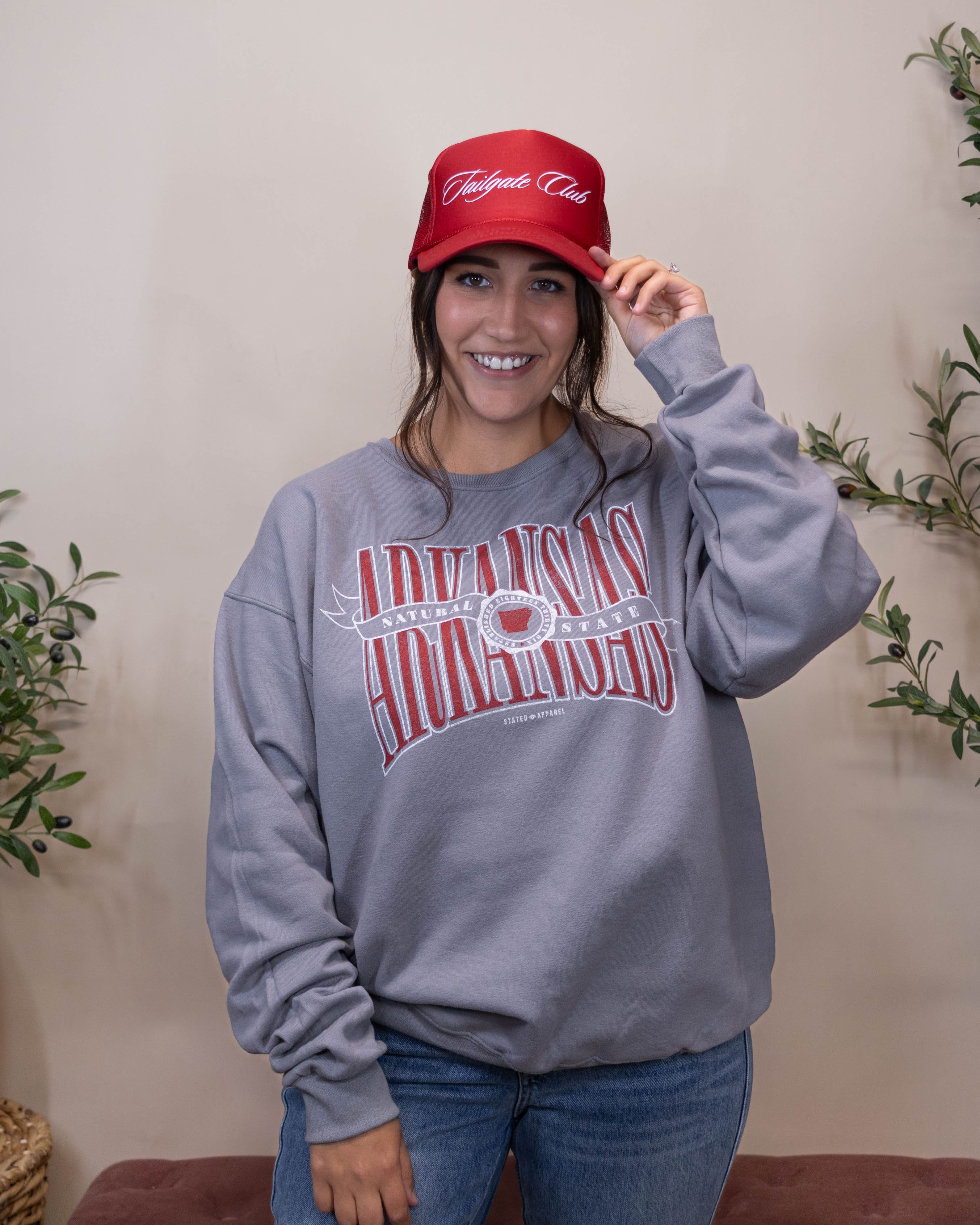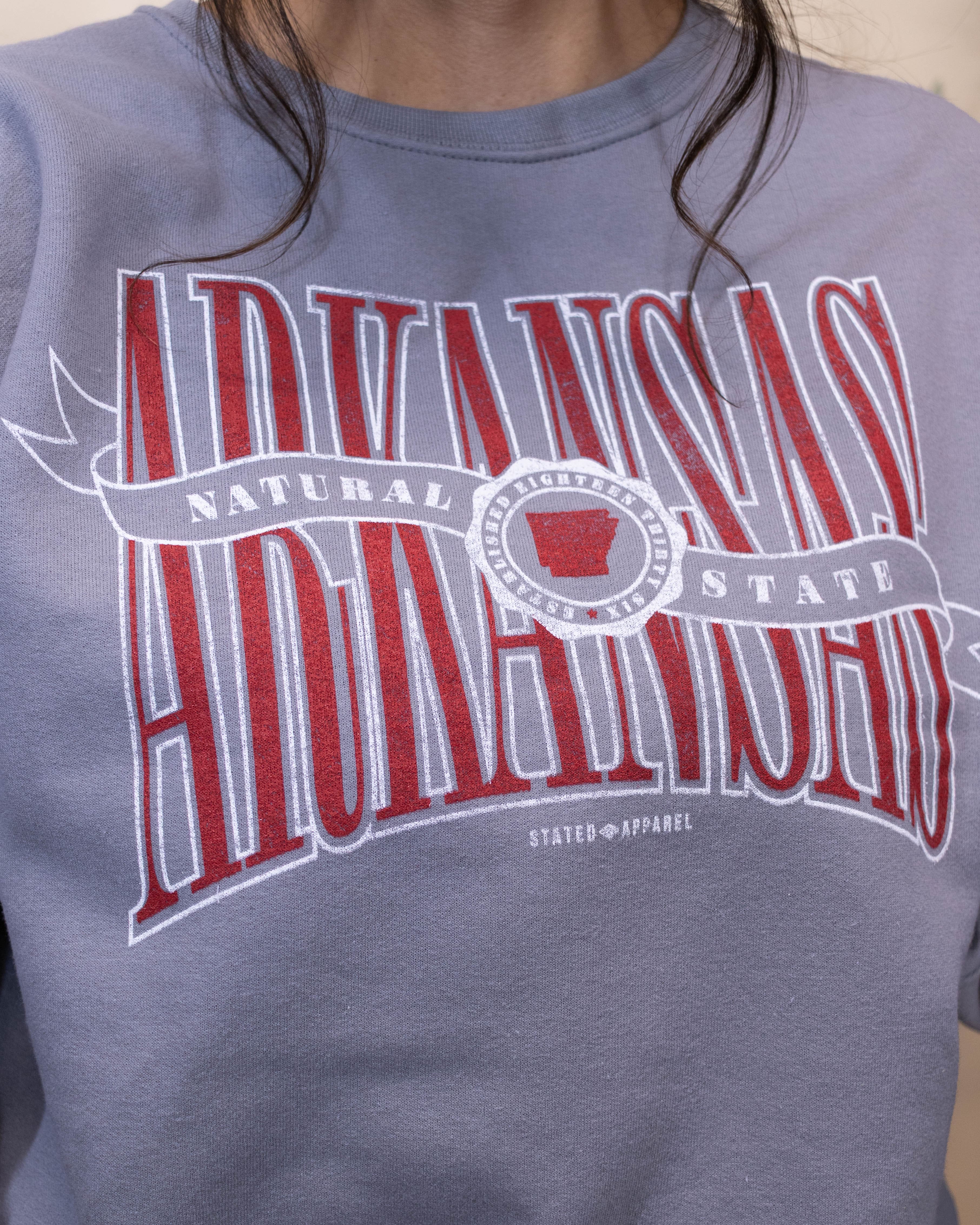 Embrace timeless style with this grey sweatshirt featuring a bold red Arkansas graphic highlighted by crisp white accents. Designed to offer both comfort and a standout look, it’s the perfect way to showcase your Arkansas pride in a classic, versatile design. Ideal for layering or wearing on its own, this sweatshirt keeps you cozy while making a confident statement.