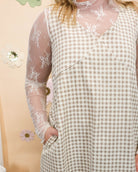 This sleeveless gingham dress in soft neutral tones features a sophisticated V-neck and pretty pleated details that bring dimension to every wear. Whether you're keeping it casual or going all-out dressy, this dress delivers.