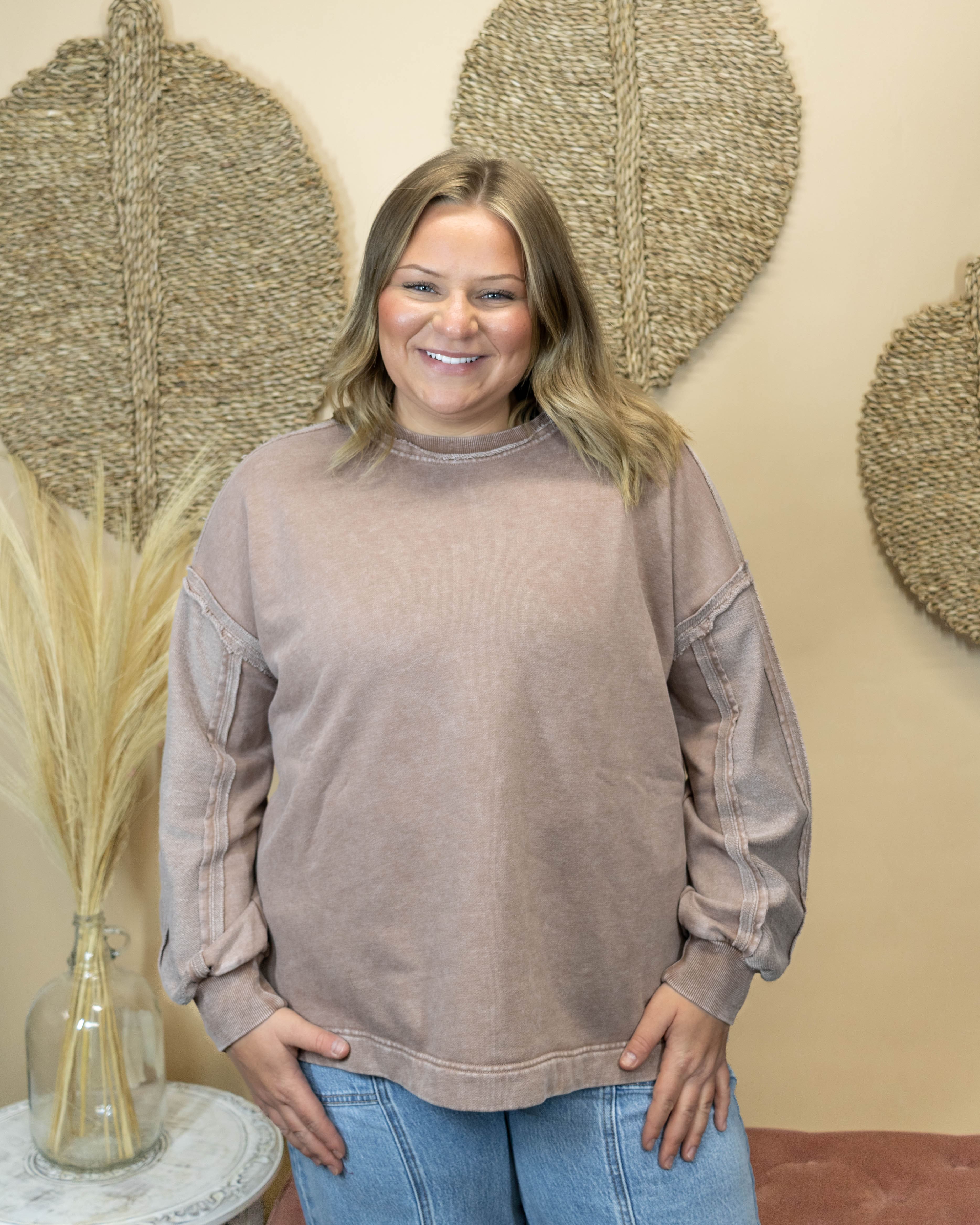 Embrace effortless style with the Going Strong Top, a versatile light brown sweatshirt featuring a subtle acid wash finish. This laid-back essential delivers comfort without compromise, perfect for layering or wearing solo. The muted, earthy tone pairs seamlessly with any wardrobe, while the gentle wash adds character and dimension. Whether you're running errands or relaxing at home, this sweatshirt becomes your go-to choice for casual confidence.