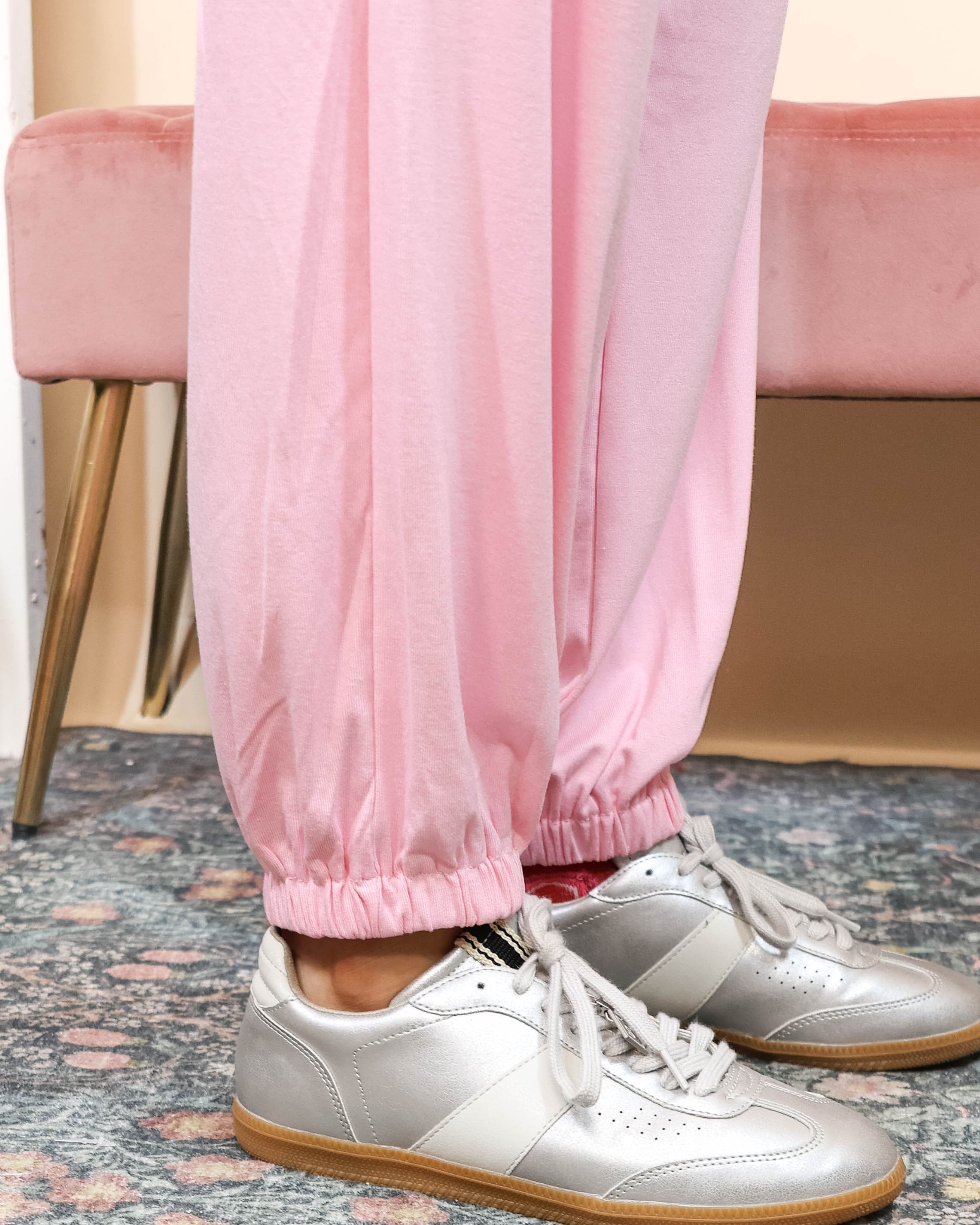 Step into this trendy light pink set and you'll want one in every color. The cropped top and high waisted joggers are designed to complement each other perfectly while staying versatile enough to mix with your existing wardrobe. This set is your new favorite for looking effortlessly cool no matter what the day brings.