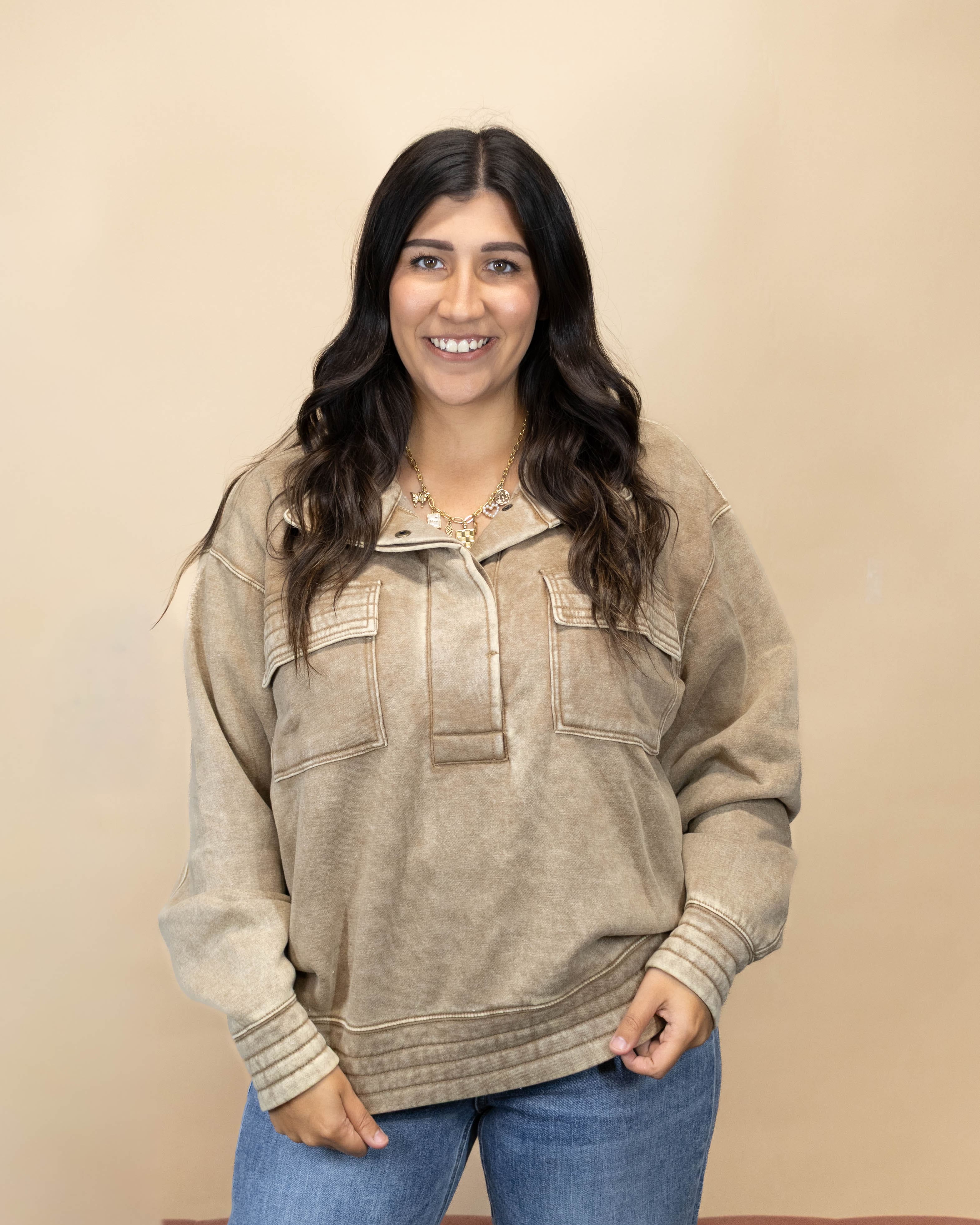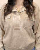 Effortlessly elevate your casual wardrobe with this versatile shacket that bridges the gap between comfort and style. Crafted in a warm beige tone with subtle distressing for an authentically worn-in aesthetic, it features a convenient quarter-zip design paired with thoughtful button detailing. Perfect for layering over your favorite tees or wearing solo, this piece delivers that coveted relaxed-yet-put-together vibe. Whether you're running errands or meeting friends, this shacket adapts to your lifestyle while keeping you looking effortlessly chic.
