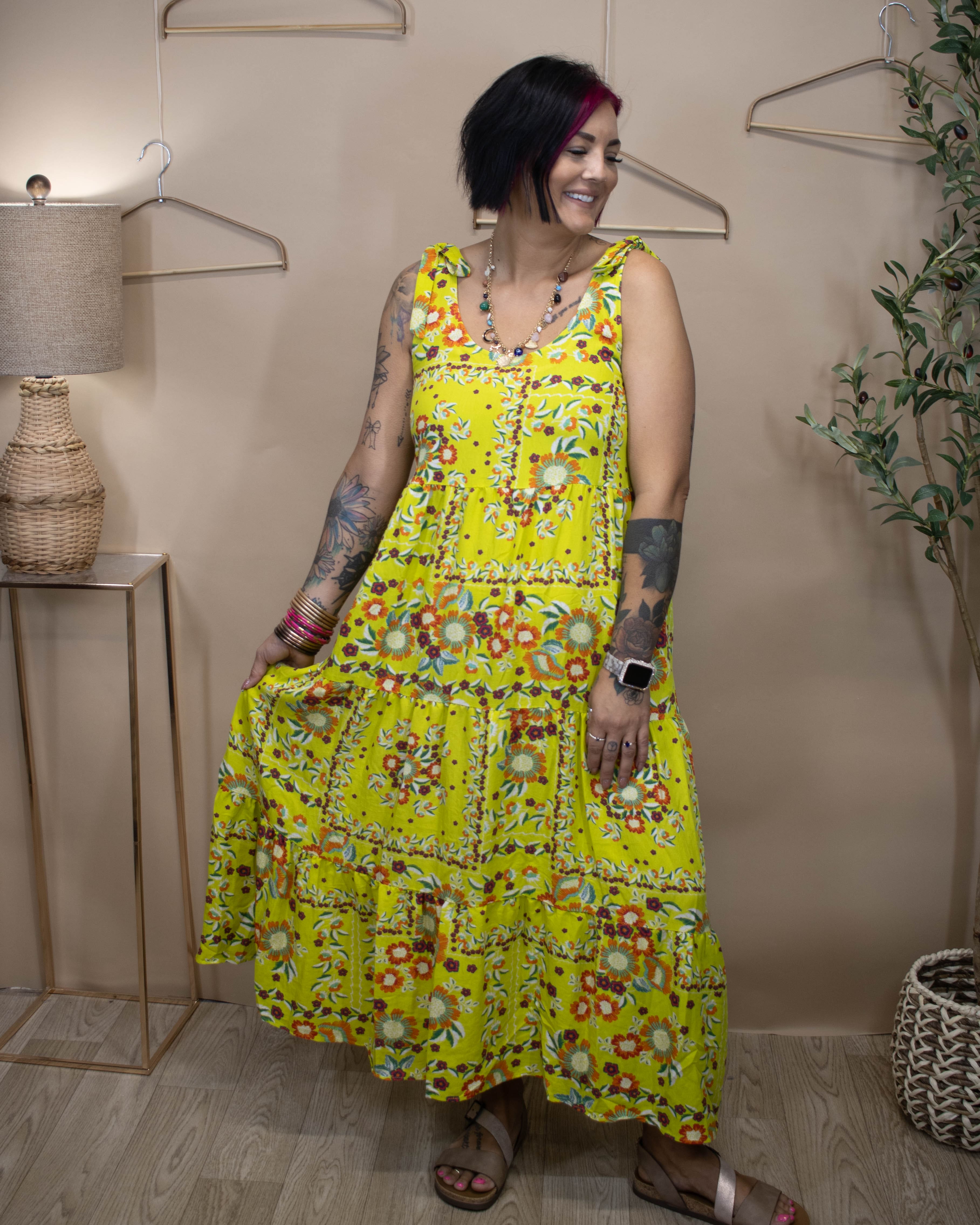 The Bright On By Midi Dress dazzles with a vibrant lime green background accented by pops of orange, dark greens, and fuchsia. Featuring adjustable tie straps for a perfect fit and convenient pockets, this maxi dress combines bold color with practical design for effortless style and comfort all day long.