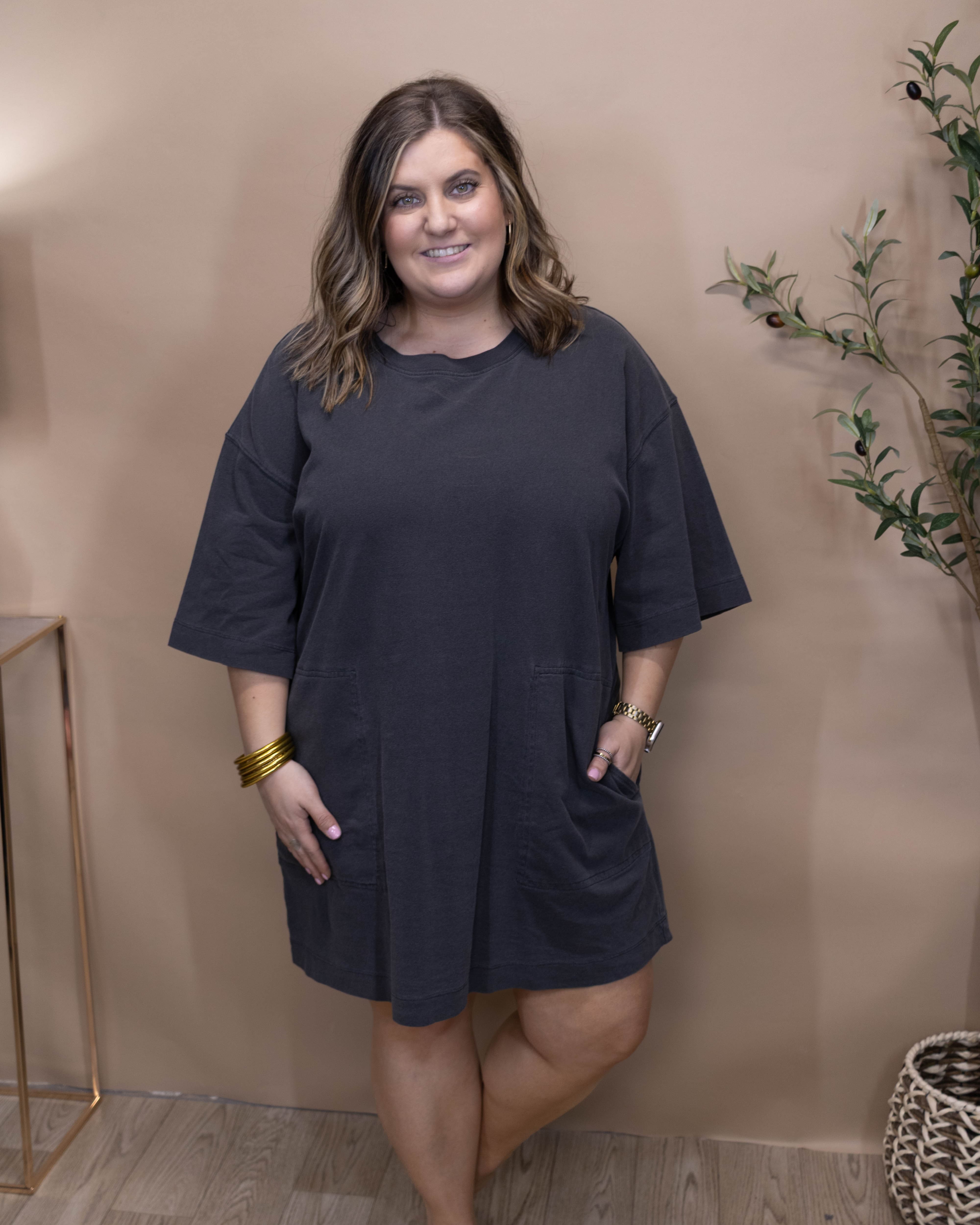 The Never Too Late Dress in black combines casual comfort with practical style. Made from soft T-shirt material, it offers a relaxed fit that feels great all day long. Featuring convenient pockets, this dress is perfect for effortless wear whether you're out and about or relaxing at home.