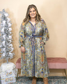Elevate your wardrobe with this stunning midi dress that seamlessly blends sophistication with vibrant style. Featuring a captivating mix of blues, greens, yellows, and orange, this piece makes an unforgettable statement while remaining versatile enough for any occasion. The long sleeves provide elegant coverage, while decorative button details running down the front add a polished touch that draws the eye. Perfect for those who refuse to compromise between comfort and fashion-forward design