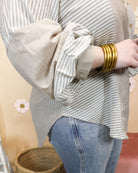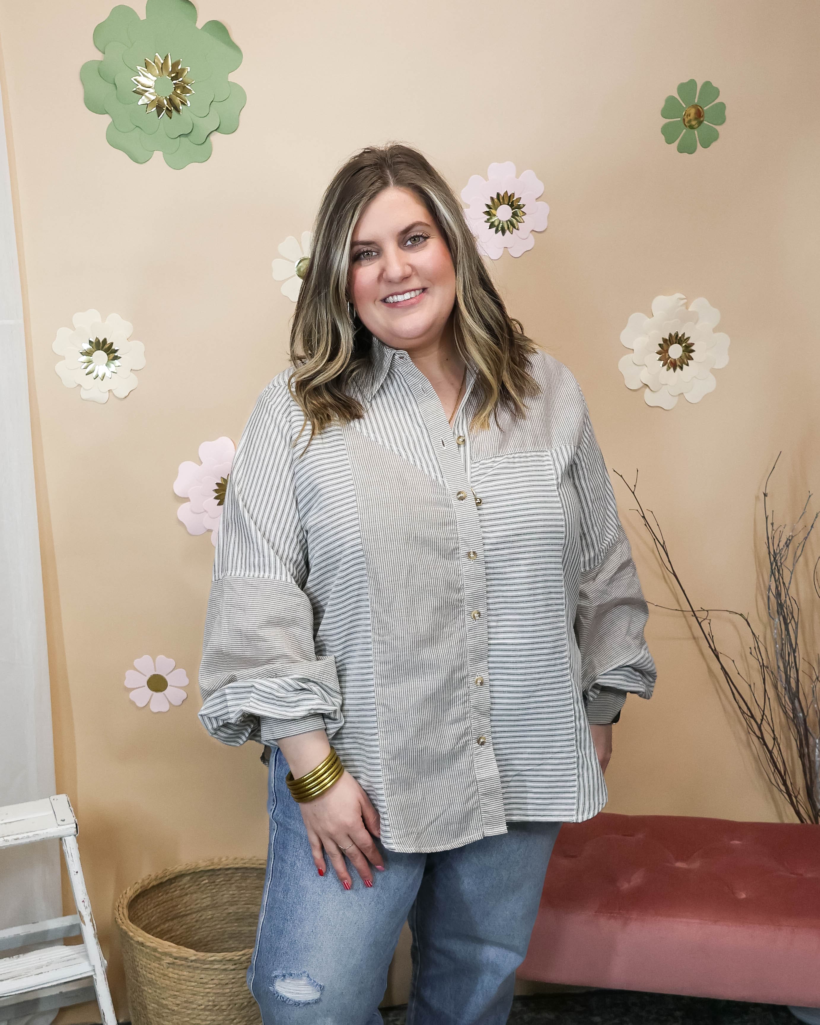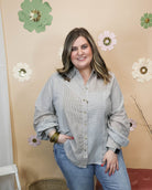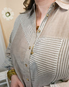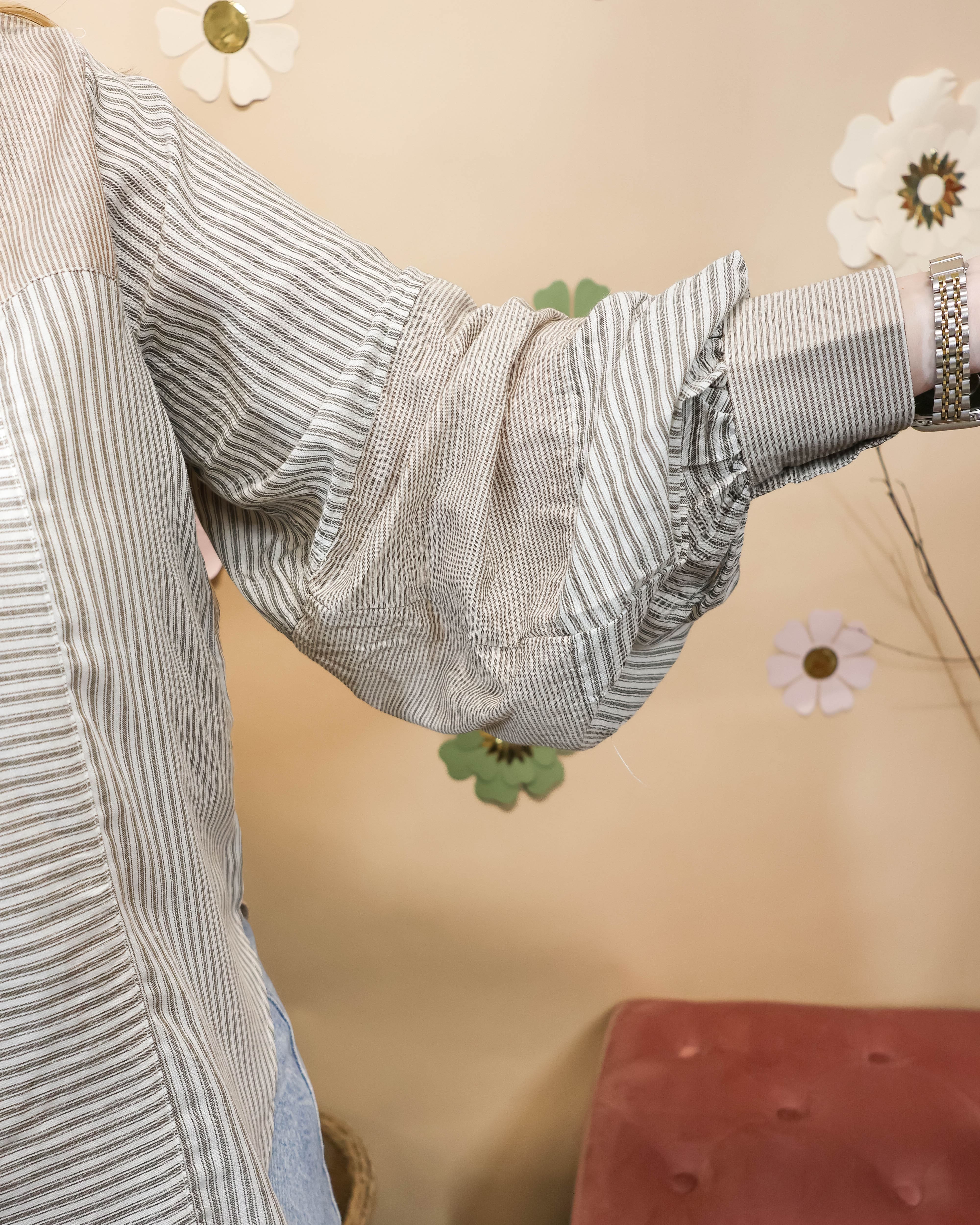 Dress it up or down—this striped button-up does both beautifully. The neutral brown tone pairs with everything in your closet, while the classic stripes add visual interest without demanding attention. Wear it buttoned for put-together polish or open it up for effortless ease.