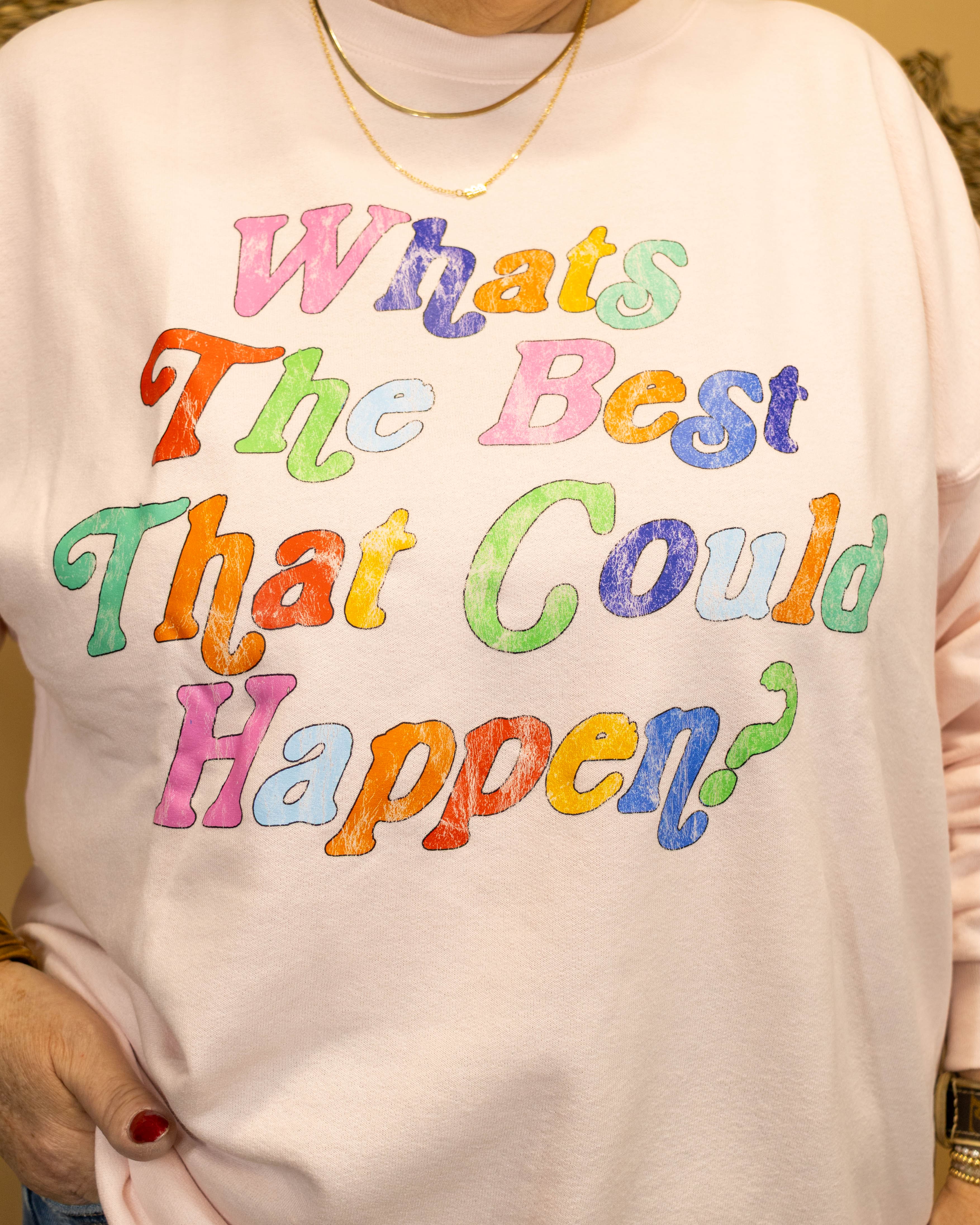 Stay cozy and stylish in the Best That Could Happen Graphic Sweatshirt. This salmon pink sweatshirt offers a soft, comfortable fit perfect for casual days. The charming rainbow detail adds a playful touch, making it an effortlessly cute addition to your wardrobe. Whether relaxing at home or out with friends, this sweatshirt keeps you looking bright and feeling great all day.