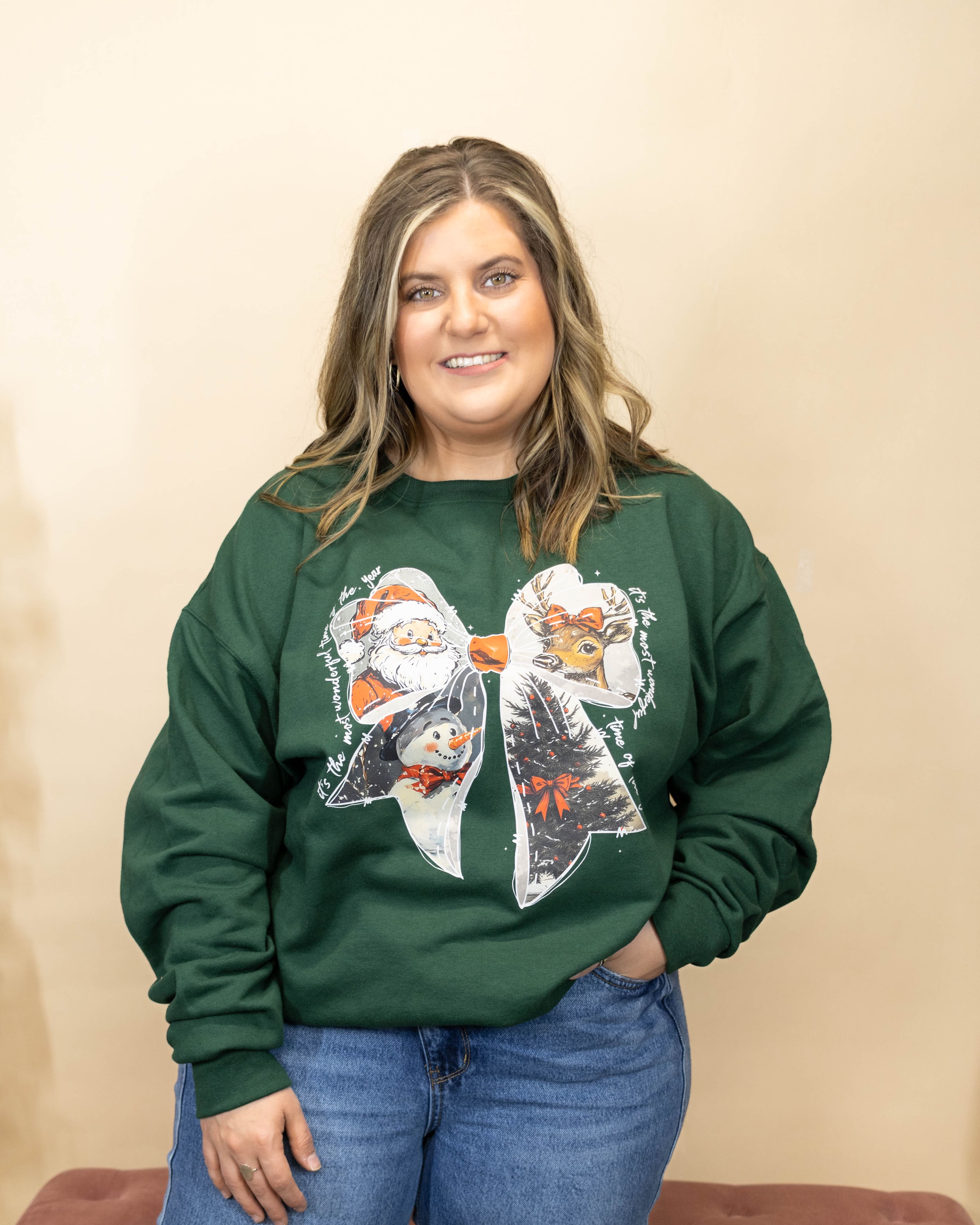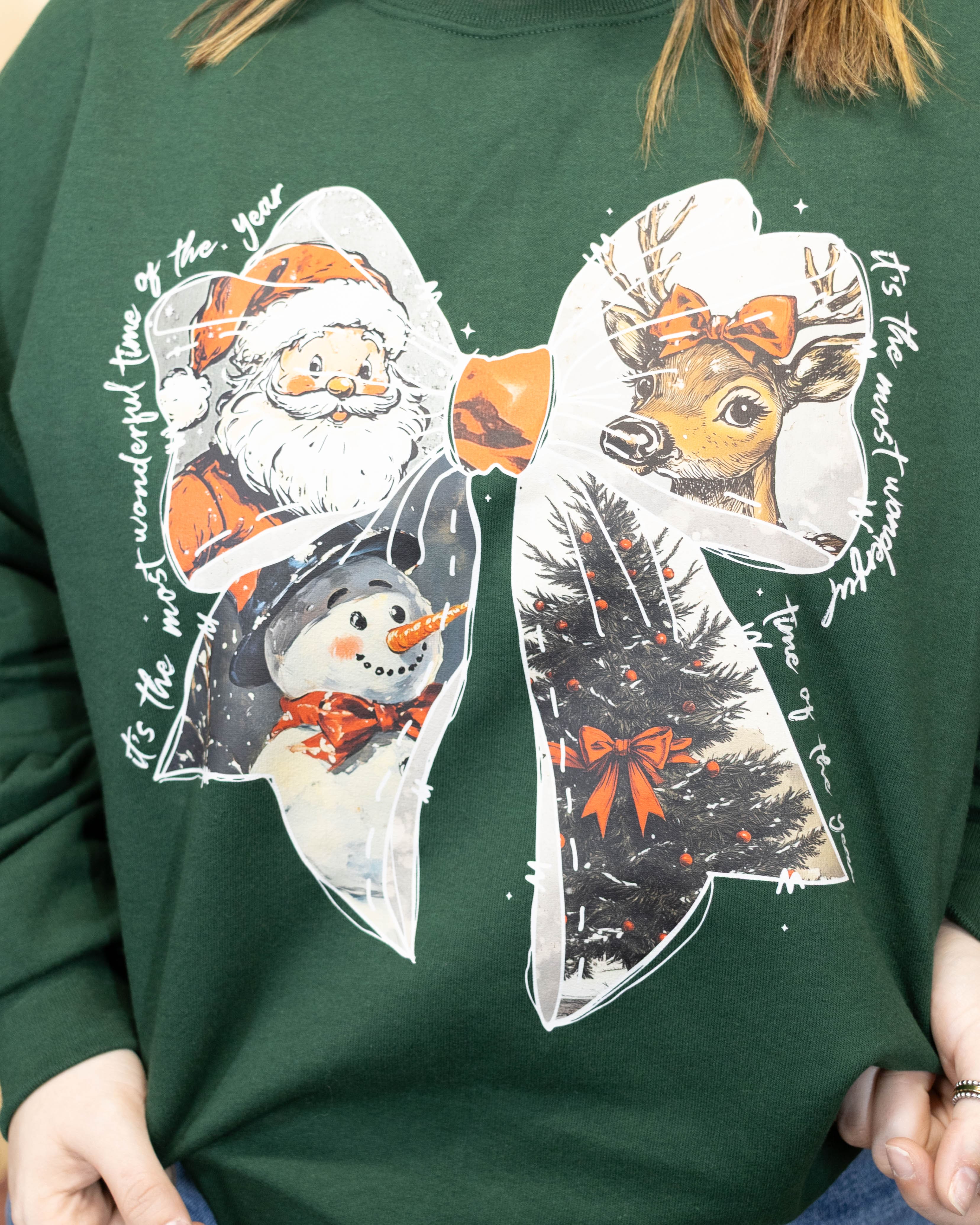 Celebrate the holiday spirit in cozy style with this green sweatshirt featuring a charming white bow and festive Santa, snowman, and reindeer details. Its timeless vintage design adds warmth and cheer to your seasonal wardrobe, making it perfect for holiday gatherings or cozy winter days. Embrace comfort while spreading festive joy effortlessly.
