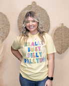 Embrace effortless style with the Dilly Dallying Graphic Tee. This cute, comfy yellow shirt combines a relaxed fit with soft fabric, making it perfect for casual days. Its cheerful color brightens your look while ensuring all-day comfort, whether you’re running errands or lounging with friends. Add a playful touch to your wardrobe that’s as easygoing as you are.