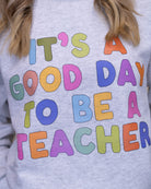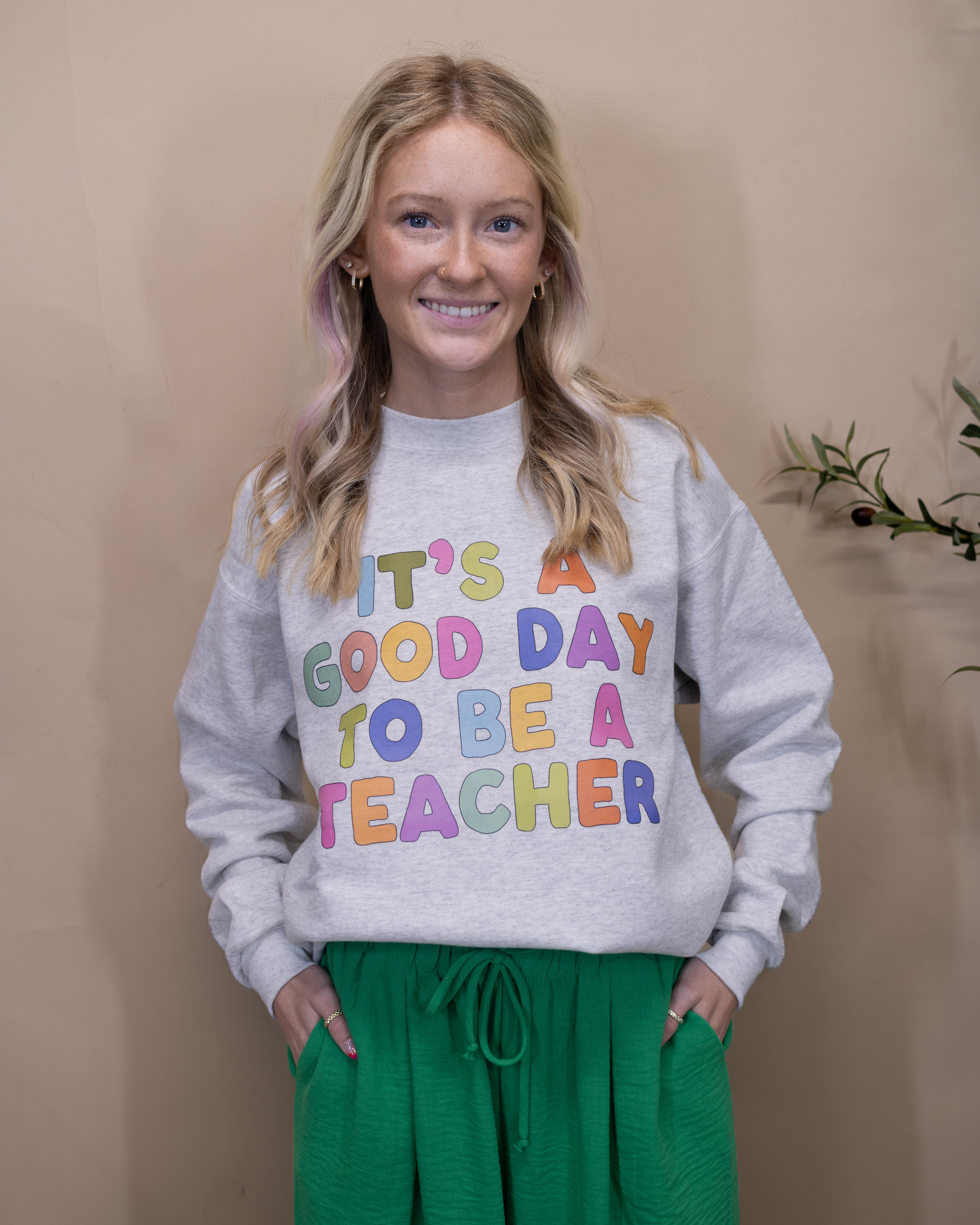 Stay comfortable and stylish with the Good Day to be a Teacher Graphic Sweatshirt. Made from soft Hanes weathered gray fabric, it features vibrant, colorful lettering from Etta + East that adds a cheerful touch to your everyday look. Perfect for educators who want to express their passion with a cozy, eye-catching design.