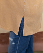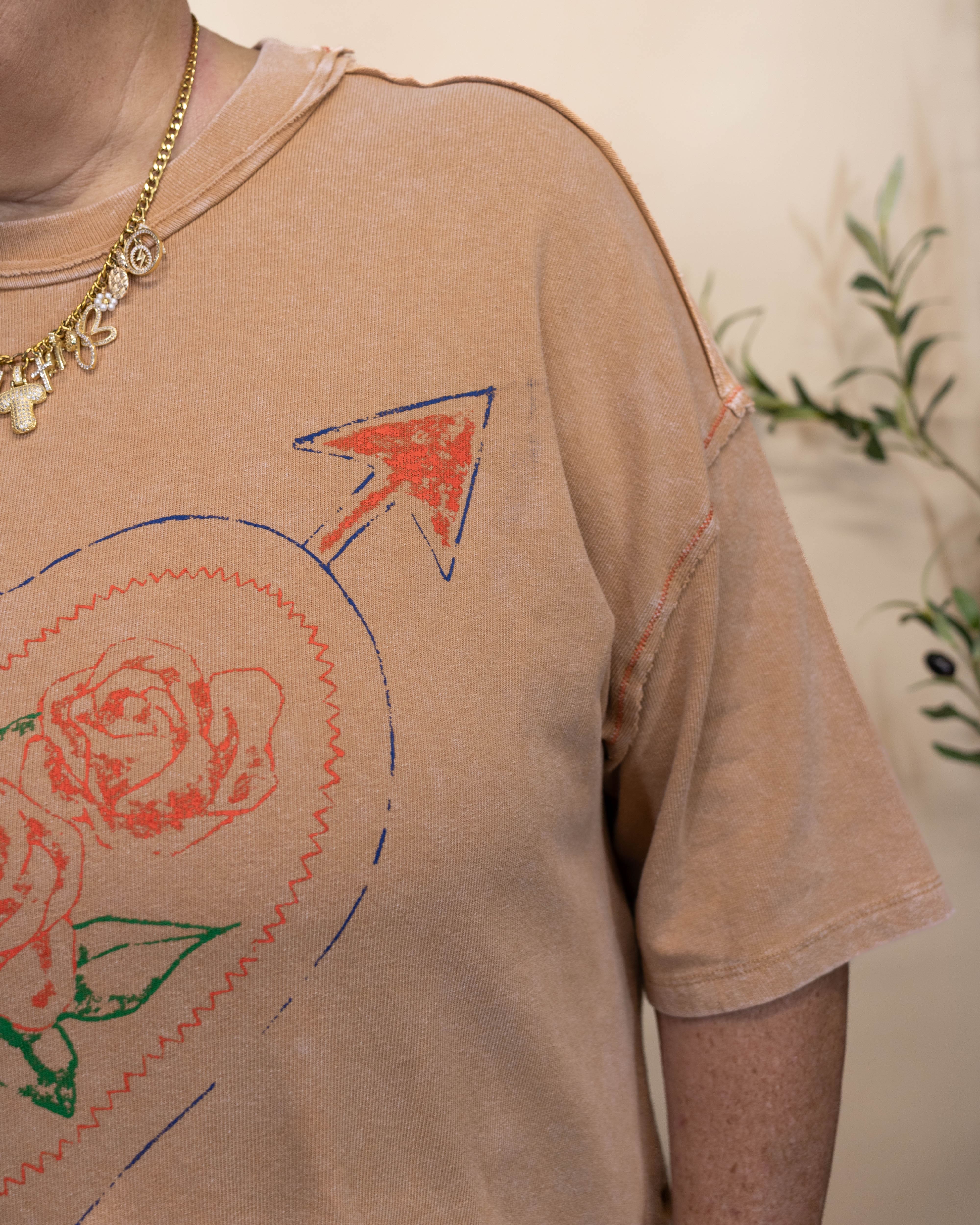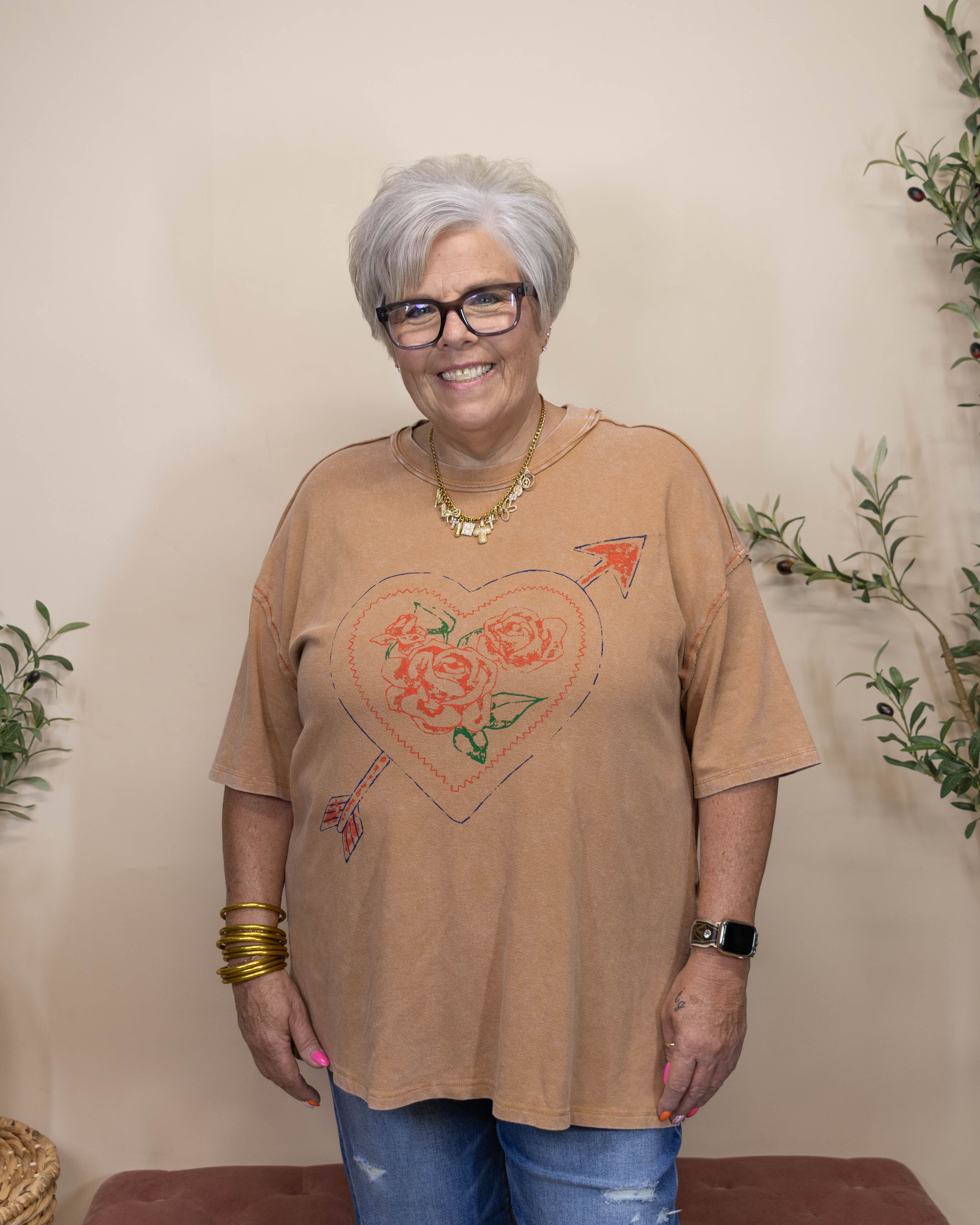 This Heart of Gold Graphic Tee is a must-have for your wardrobe. The distressed graphic and soft lightweight material make it both stylish and comfortable. With a small slit on the side, it adds the perfect touch of detail to any outfit. Get yours today and add some charm to your look.