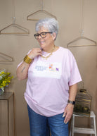 Looking for a tee that's both stylish and quirky? You're in luck! This pink tee features a playful postcard graphic with the phrase "there's no place like home." Perfect for those who appreciate a little humor in their wardrobe.