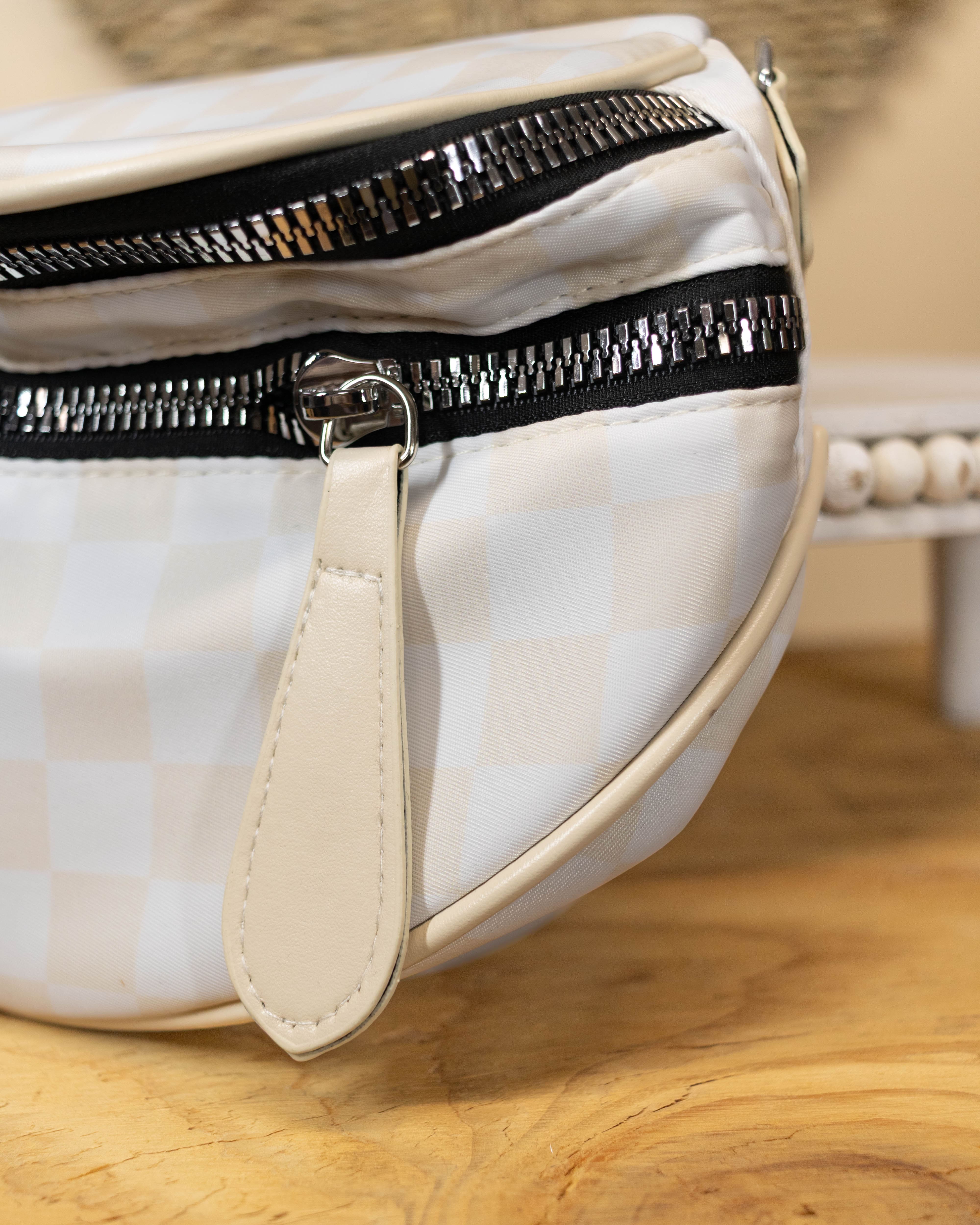 Stay stylish and organized with the Check Yourself Bum Bag in beige! Its chic checkered design adds a touch of personality while the beige strap and back zipper provide convenience and extra storage. Keep your essentials close and your hands free, perfect for any adventure!
