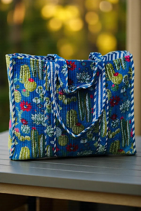 Make a bold statement with this rich blue velvet tote, where desert inspiration meets everyday elegance. The vibrant cactus and floral print pops against the deep blue backdrop, giving it a striking, playful charm. Crafted with soft quilted velvet, it feels as luxurious as it looks, while the roomy interior makes it perfect for carrying everything from daily essentials to weekend getaway must-haves.