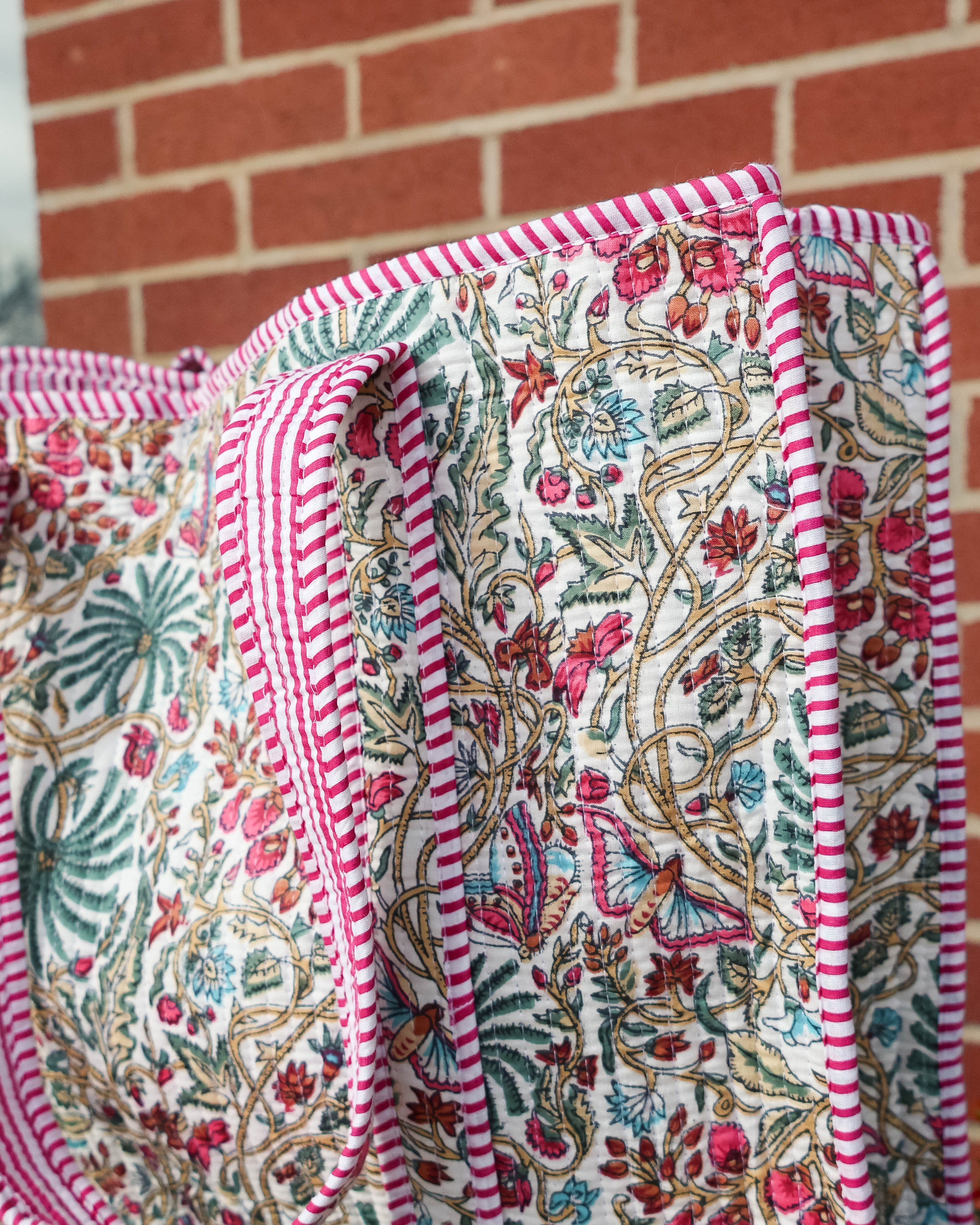 Carry your essentials in style with this quilted tote bag, featuring a vibrant floral print that adds personality to any journey. Crafted from soft, lightweight quilted material, it's designed for travelers who refuse to compromise on comfort or flair. The spacious interior keeps your belongings organized while the durable construction ensures it holds up through countless adventures. Whether you're heading to the airport or exploring your city, this versatile bag is your perfect travel companion.