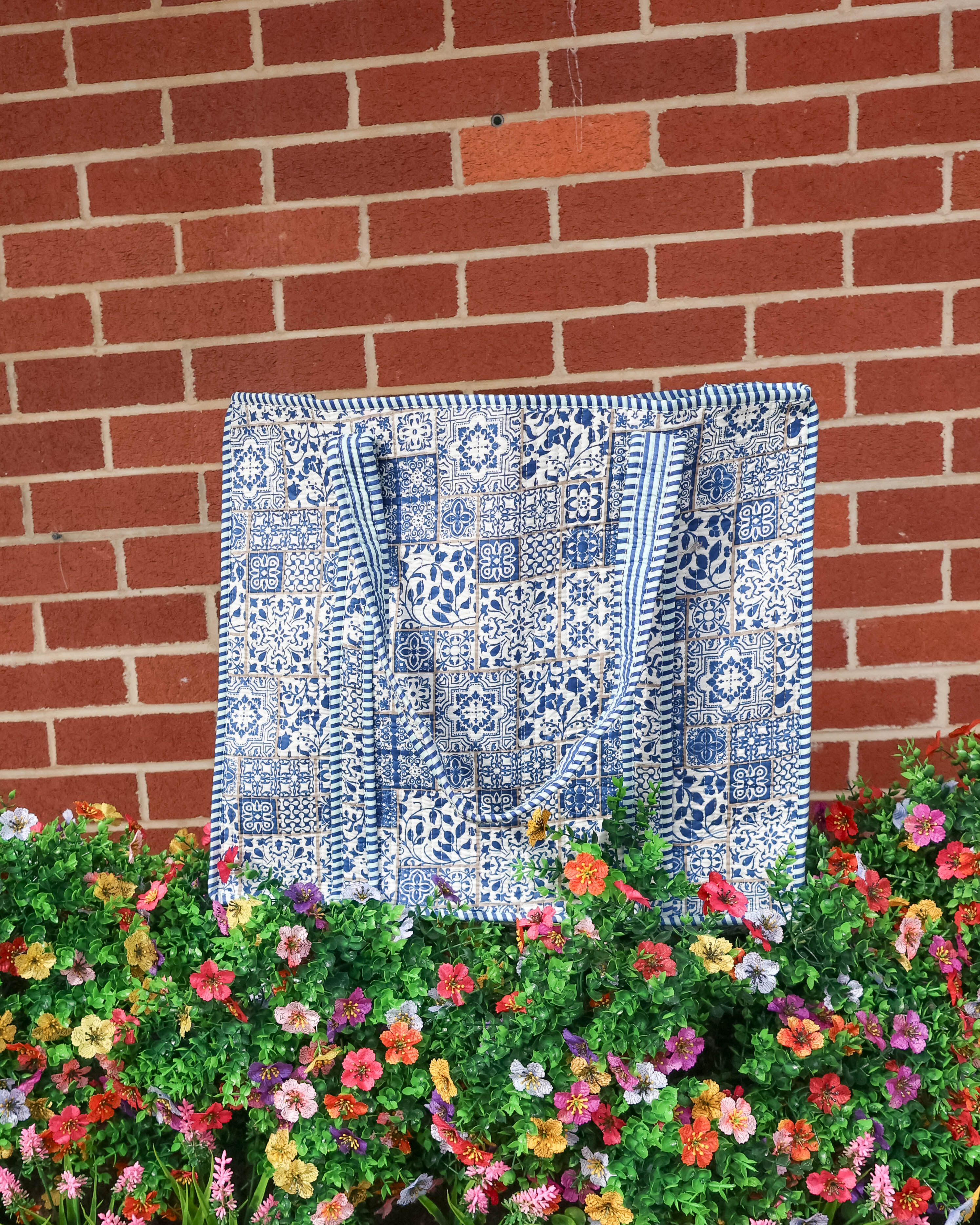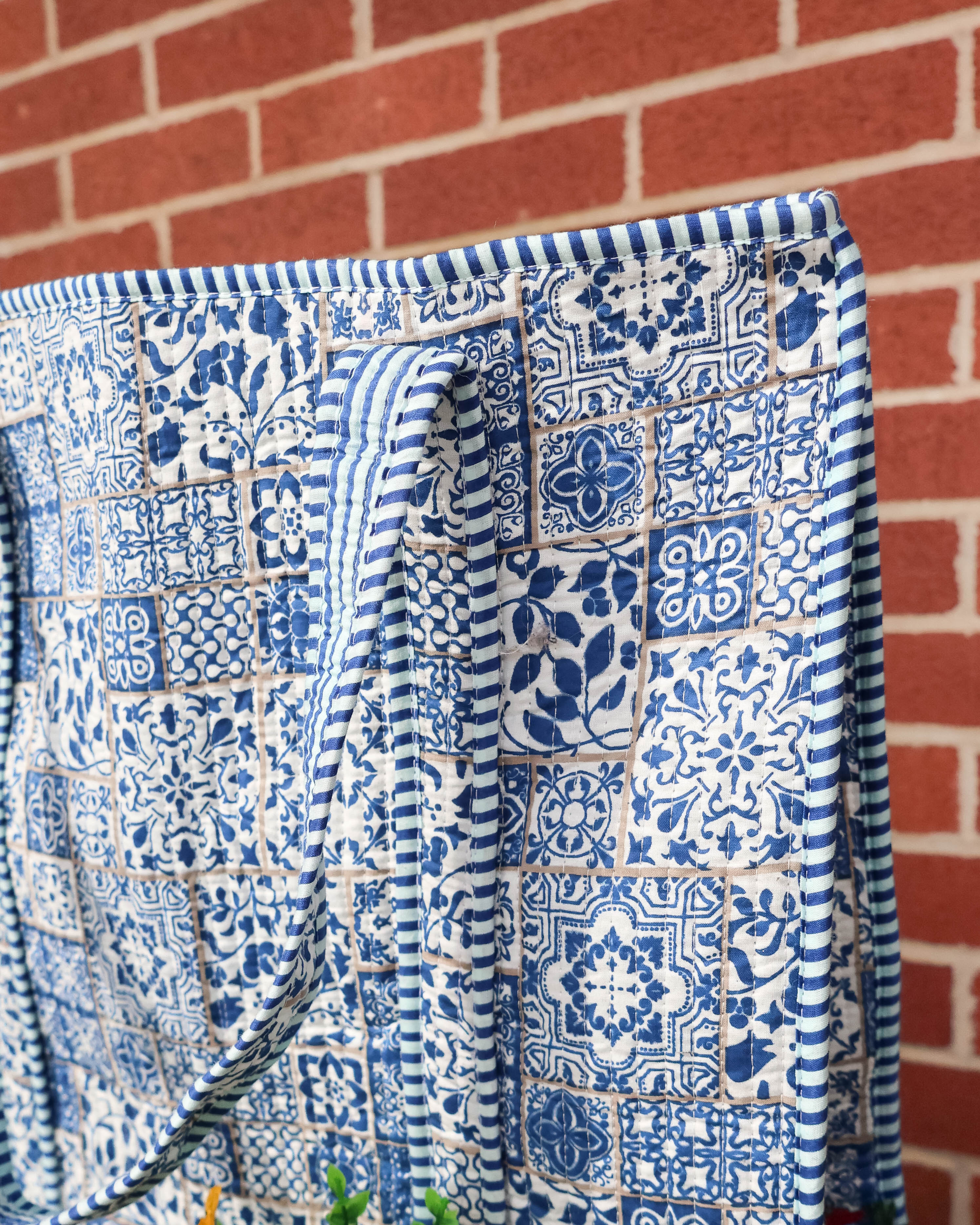 Carry your essentials in style with this quilted tote bag, featuring a vibrant patchwork blue print that adds personality to any journey. Crafted from soft, lightweight quilted material, it's designed for travelers who refuse to compromise on comfort or flair. The spacious interior keeps your belongings organized while the durable construction ensures it holds up through countless adventures. Whether you're heading to the airport or exploring your city, this versatile bag is your perfect travel companion.