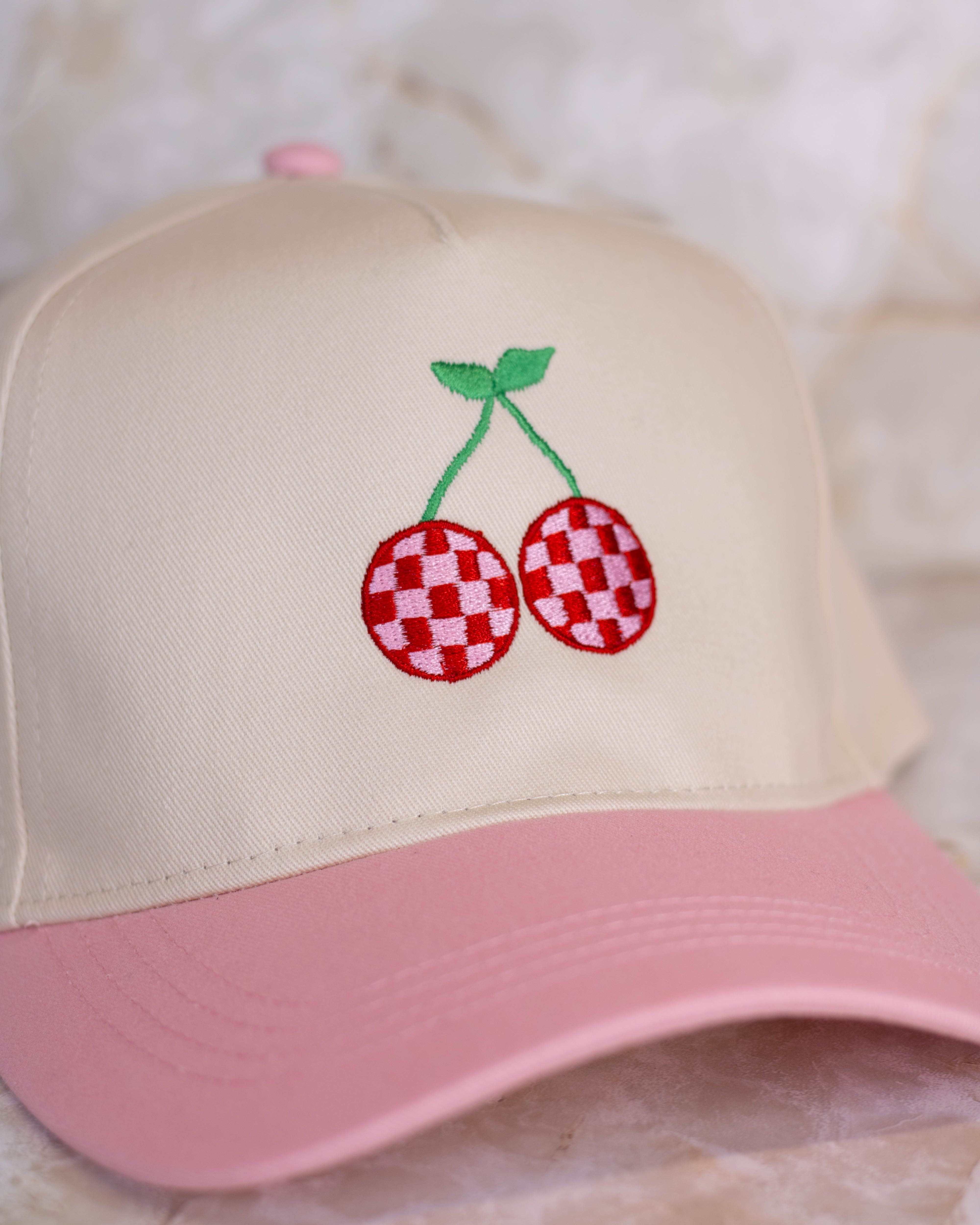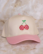 This playful trucker hat features a tan crown paired with a light pink bill, topped off with a charming embroidered design of cherries in pink and red check. Perfect for adding a fun, fruity touch to your casual outfits while keeping you cool and comfortable.