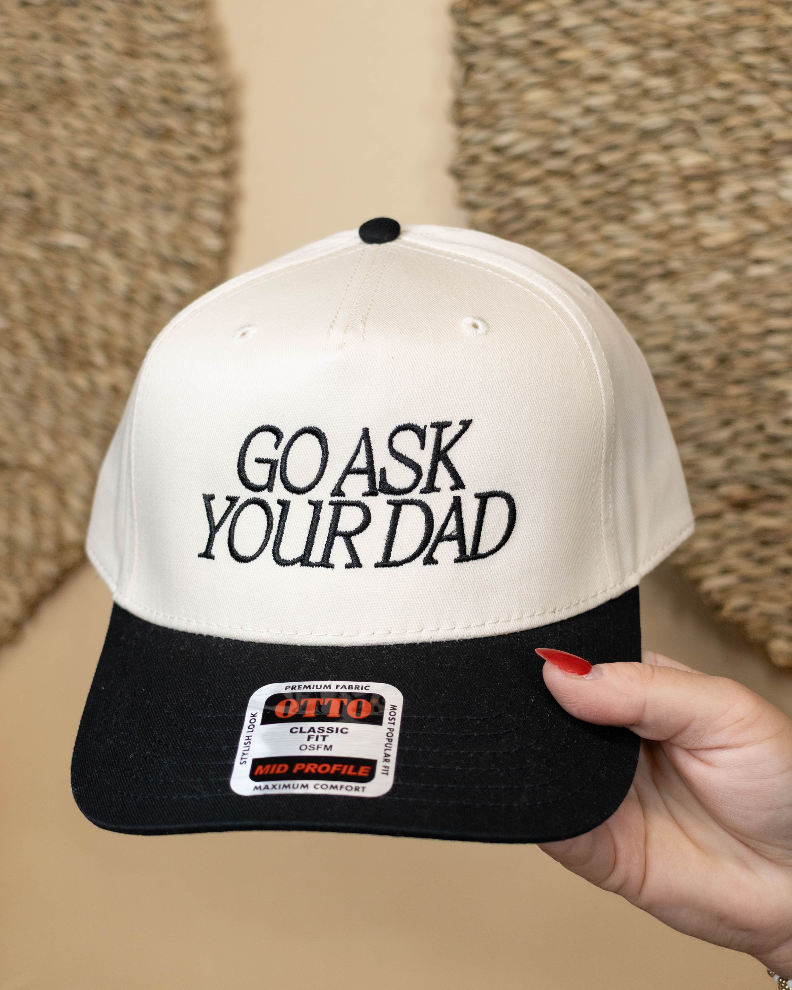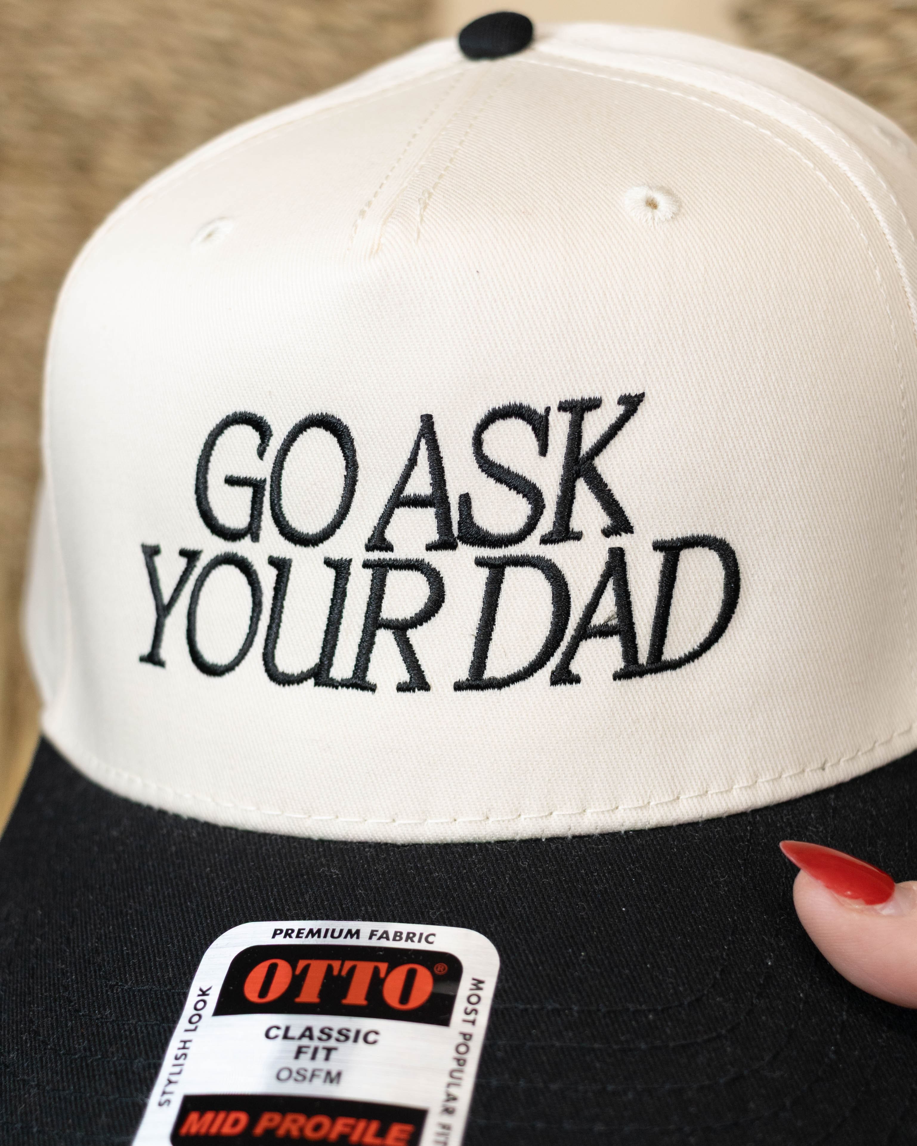 This black trucker hat featuring the playful “Go Ask Your Dad” phrase offers a simple and charming way to add personality to any outfit. Its classic design ensures comfort and breathability, making it an easy go-to accessory for everyday wear. Perfect for casual outings, it’s a fun conversation starter that keeps your style laid-back yet memorable.