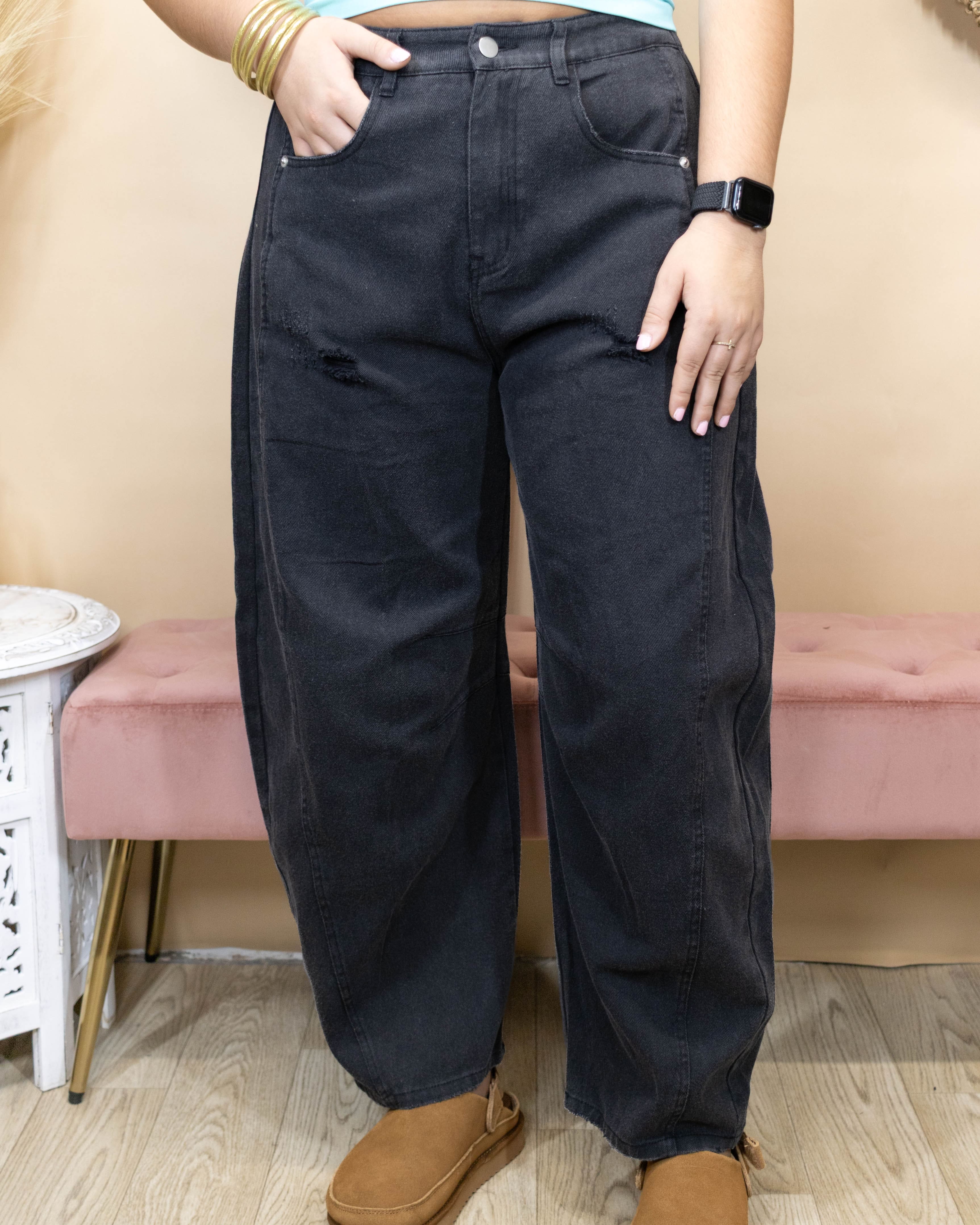 Experience effortless style and comfort with the black barrel jeans featuring subtle distressing and a flattering cropped length. Designed with an elastic waistband and convenient pockets, these jeans offer a perfect blend of practicality and trendiness. Elevate your everyday look with a pair that moves with you and keeps you confident all day long.