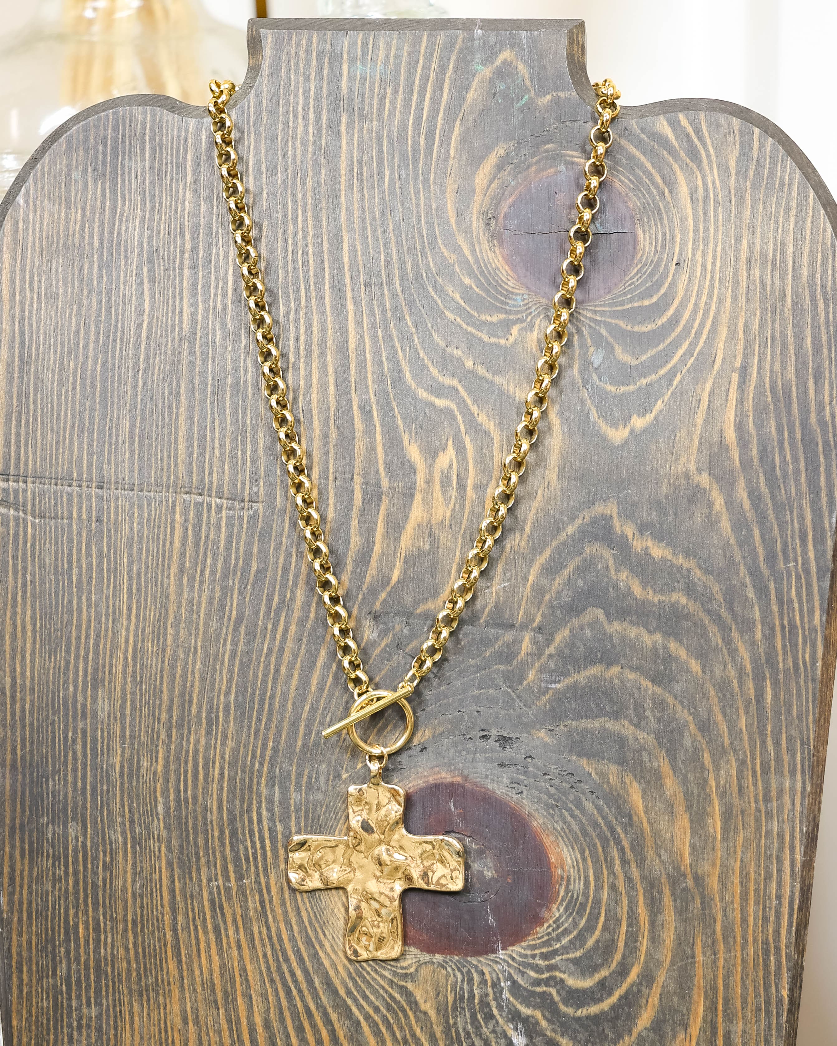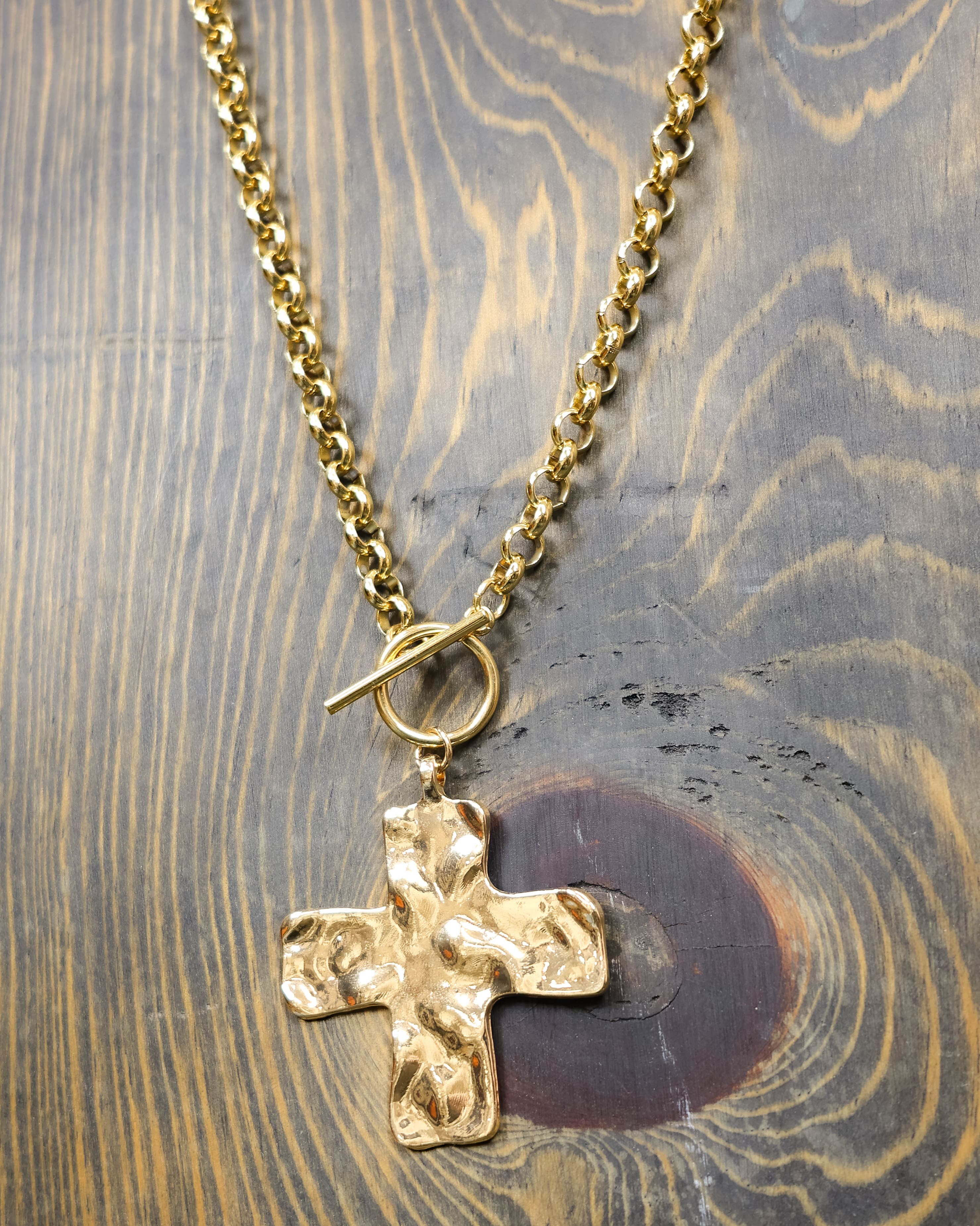 This striking cross toggle necklace combines timeless elegance with modern edge. Crafted in gleaming gold, its chunky design makes a bold statement while remaining versatile enough for everyday wear or special occasions. The toggle closure adds both functionality and visual interest, creating a piece that's as practical as it is beautiful. Perfect for layering or wearing solo, this necklace brings an effortless sophistication to any outfit.
