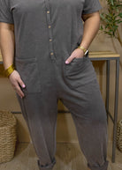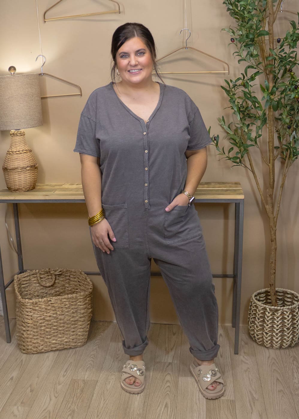 Experience effortless style and comfort with our All The Good Jumpsuit! This grey jumpsuit features convenient pockets, stunning button detailing, and a flattering fit for all body types. Perfect for a day at the office or a night out on the town. Elevate your wardrobe with this must-have piece!