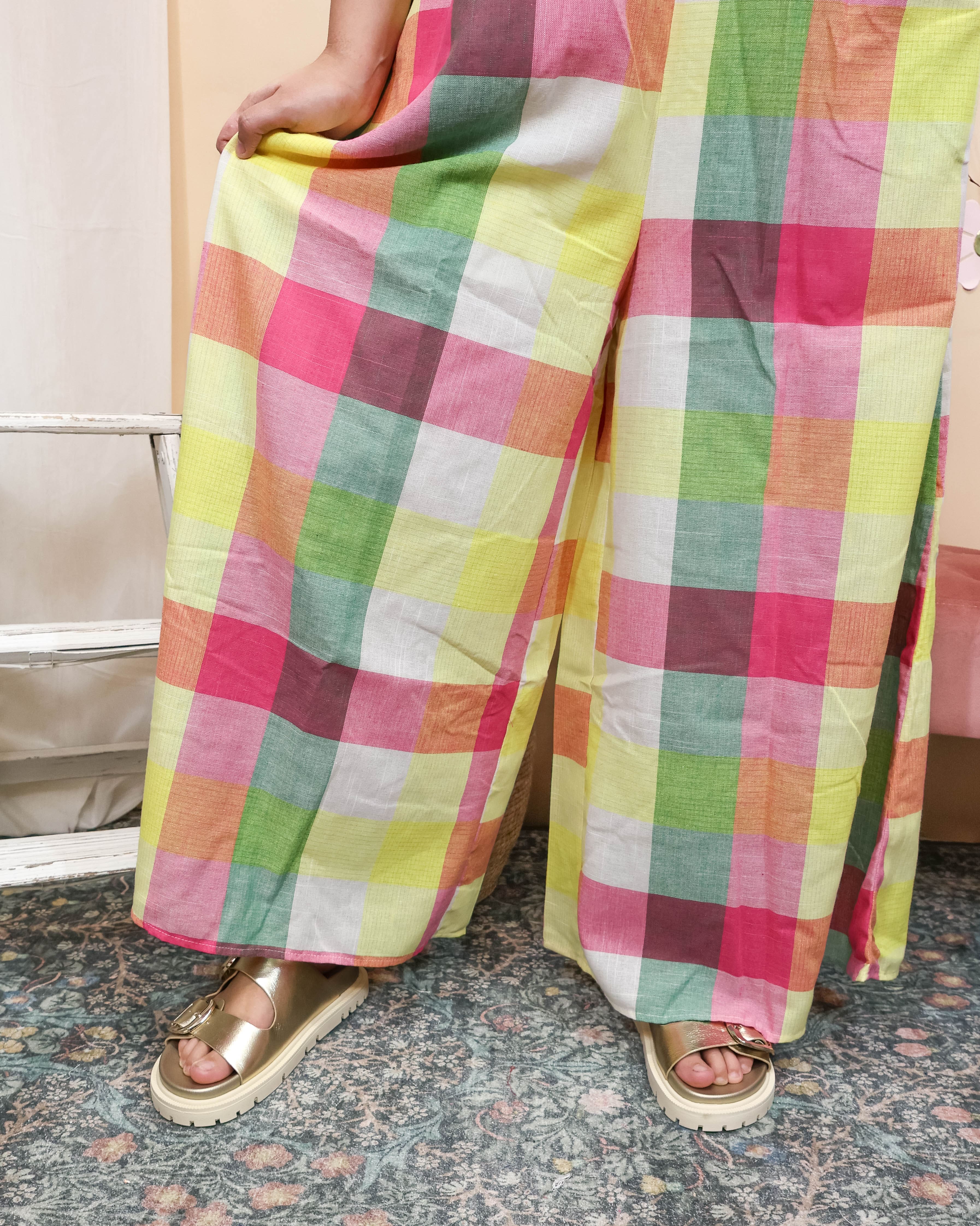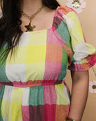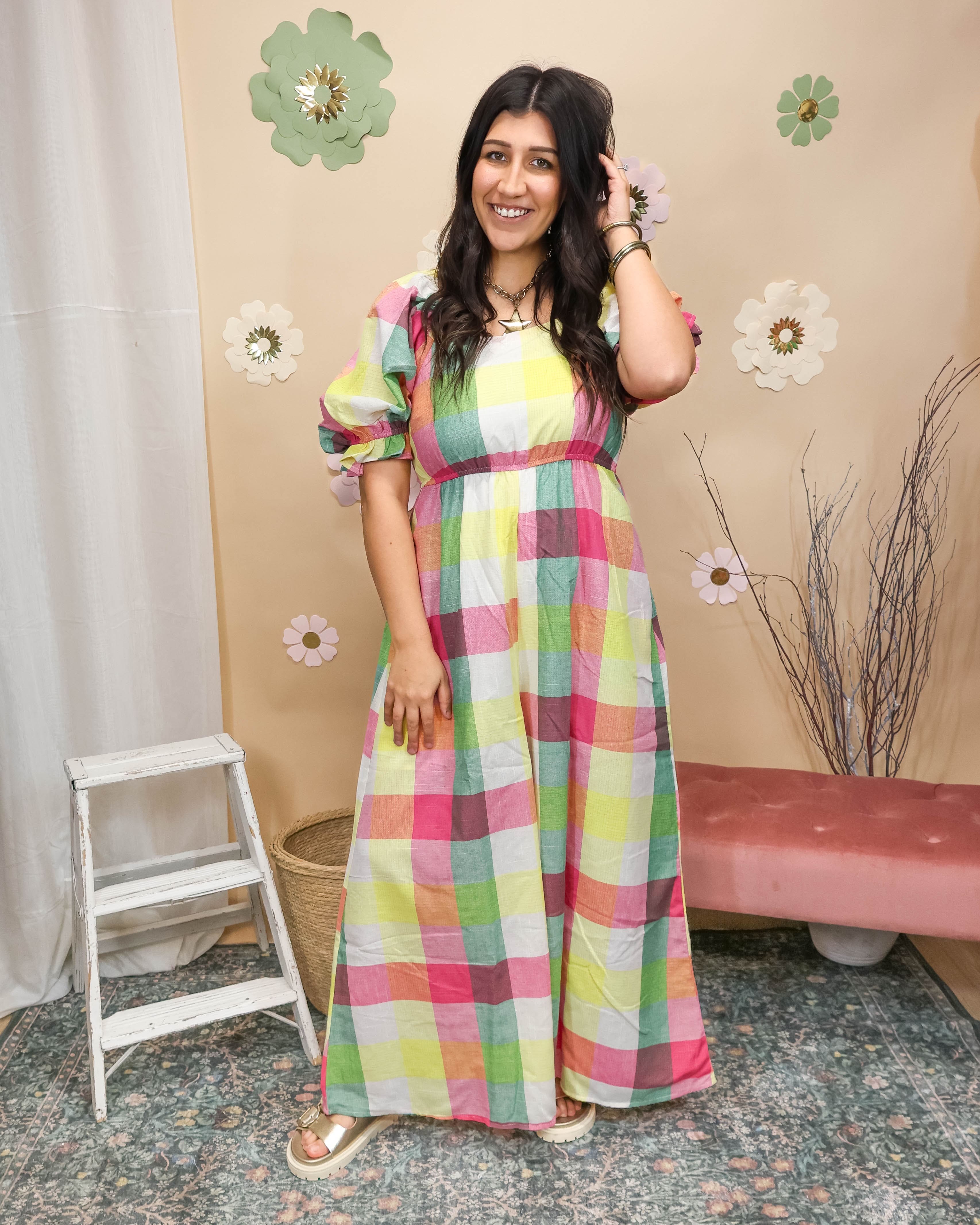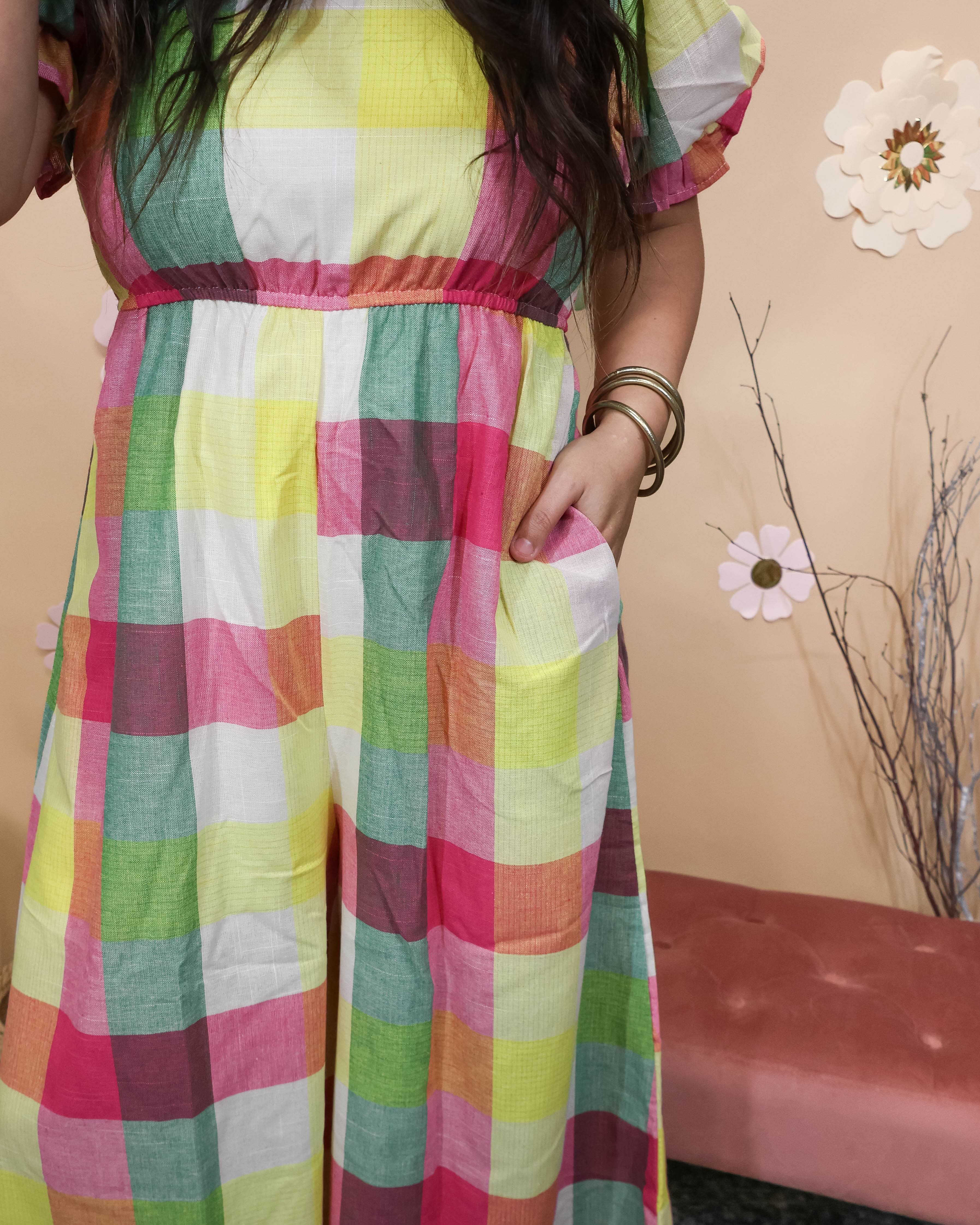 The Check It Out Jumpsuit is your ticket to effortless confidence. Wrapped in vibrant, colorful plaid that practically glows, it features playful bubble shoulders that add dimension and fun. The relaxed wide-leg silhouette flows beautifully while the stretch back keeps you comfortable and supported all day.