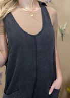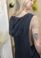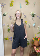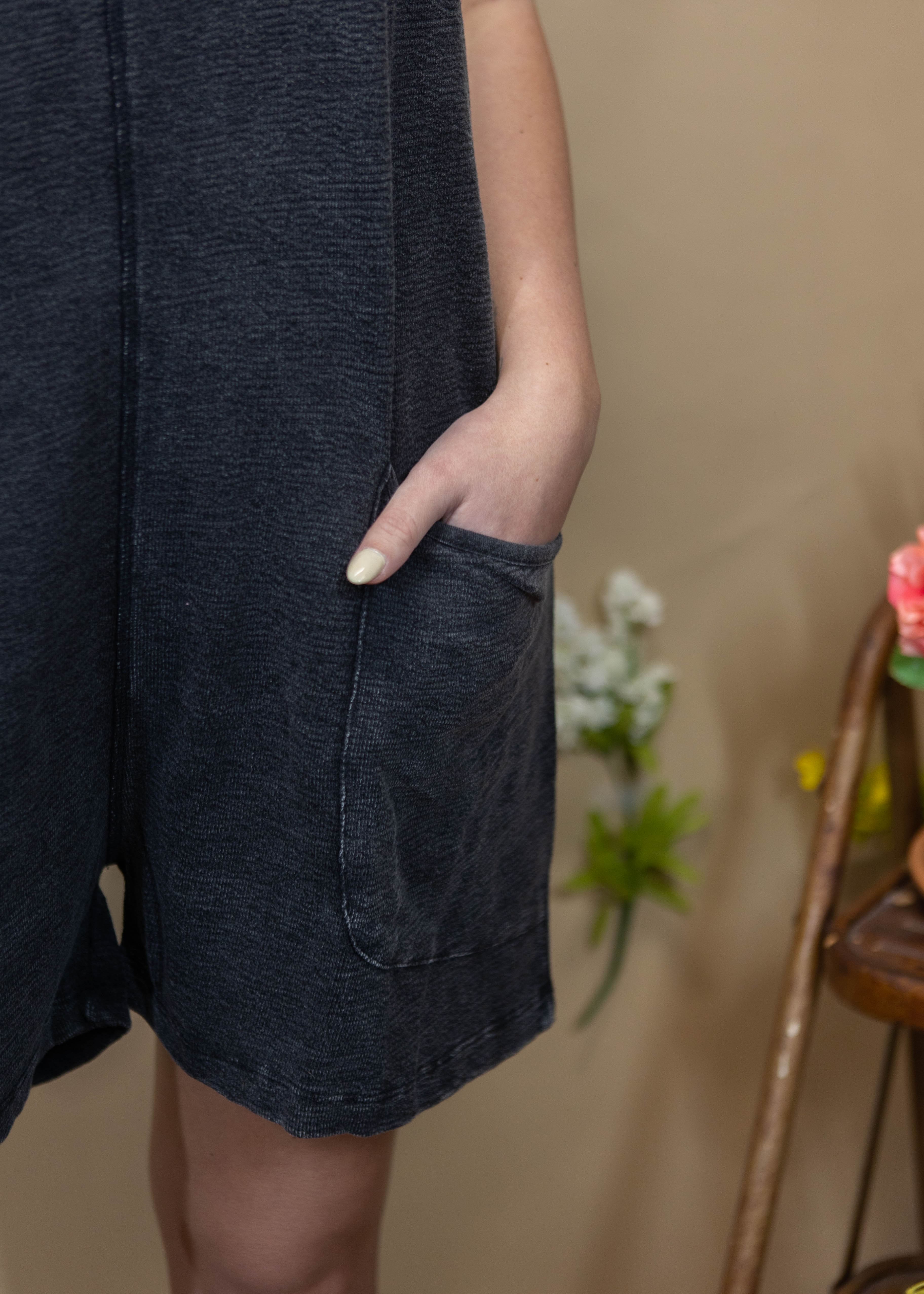 Stay cozy and stylish in our When We Go Hooded Romper. This black romper features a hood, pockets, and a scoop neck line - perfect for a fun day out!