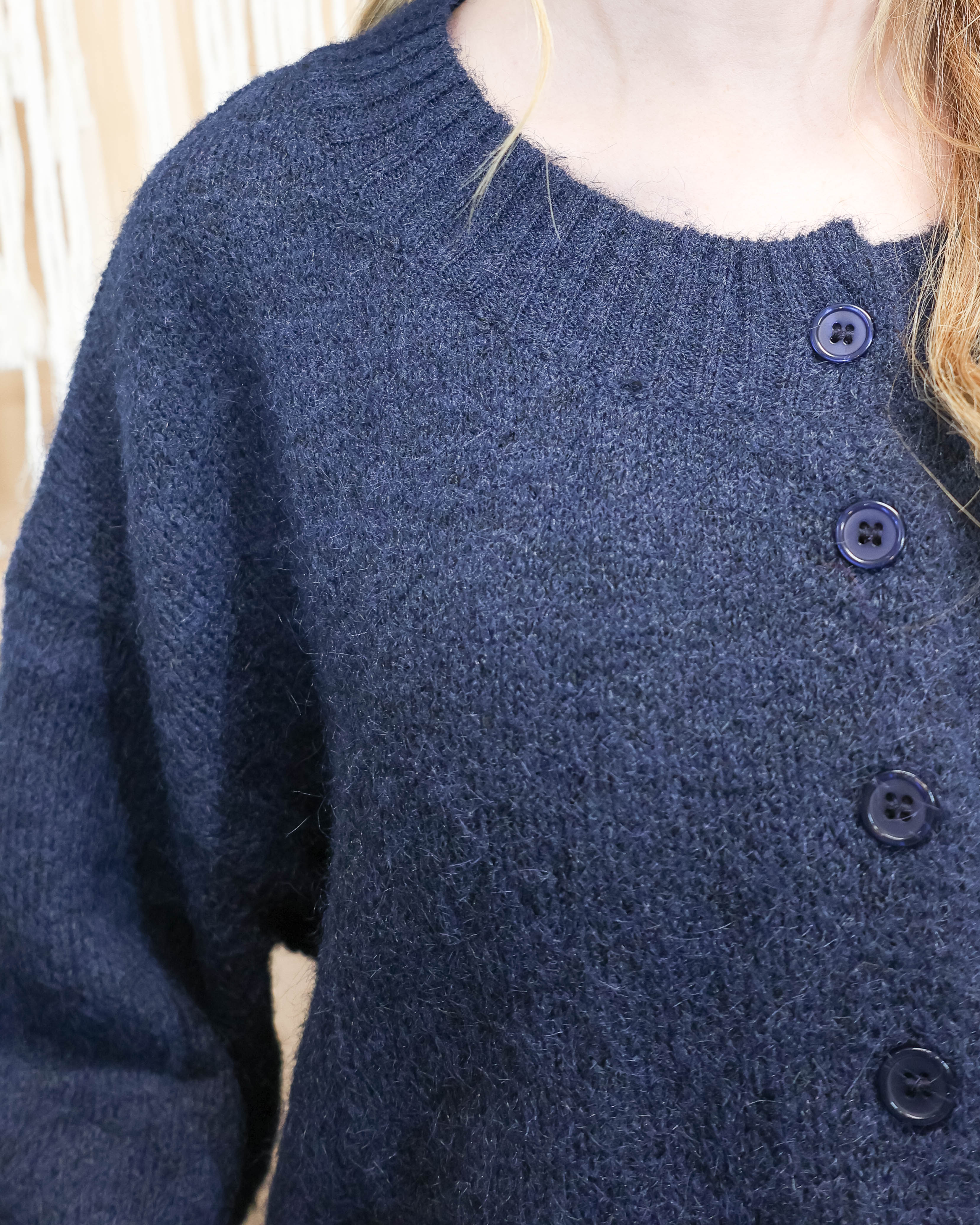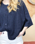 Layer like a pro with this navy cardigan. Soft and touchable with half sleeves that hit just right, it buttons down for easy styling and works over everything in your closet. Whether you're layering for warmth or adding dimension to your look, this is the piece that makes it all come together.