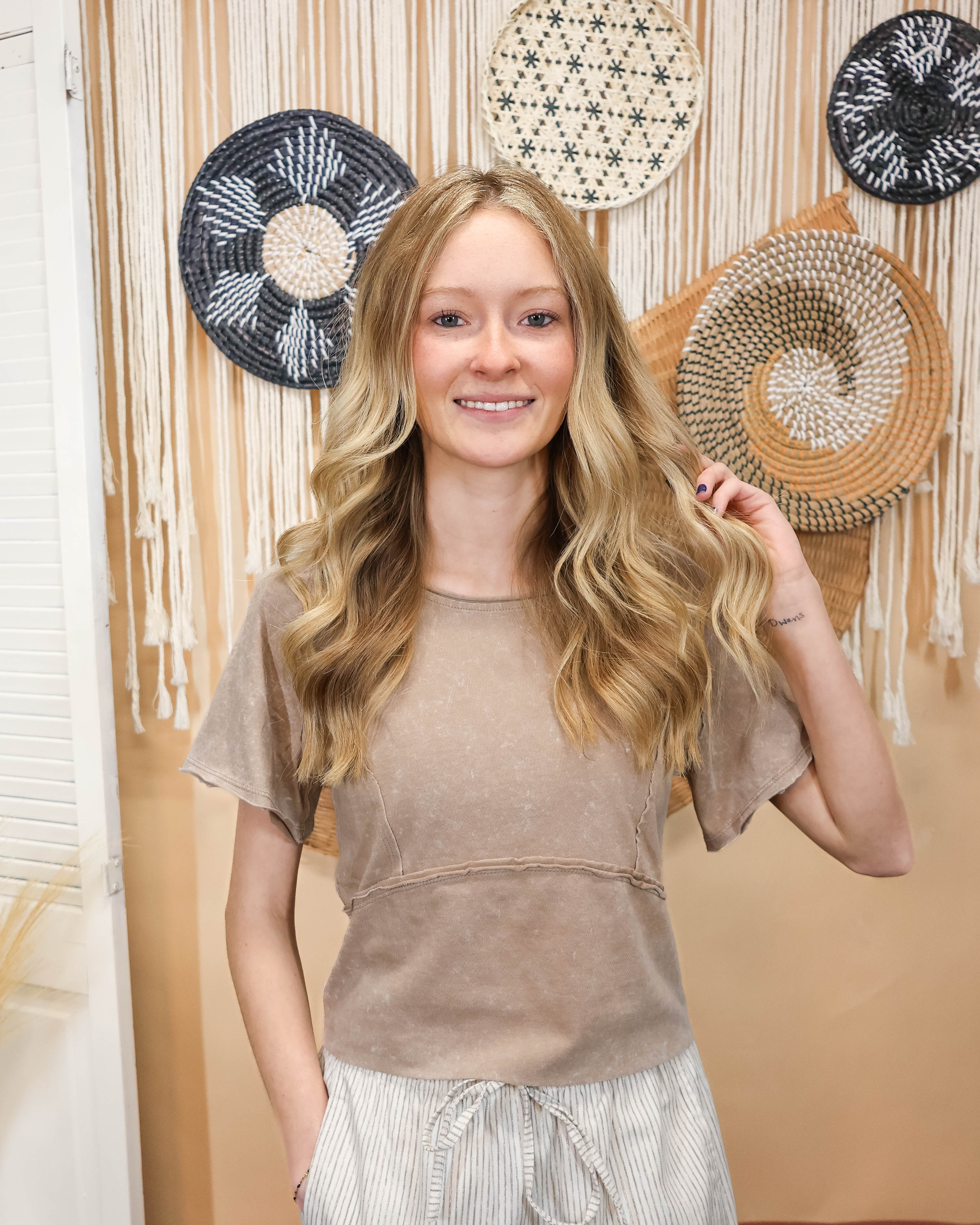 Your closet called—it needs this. A cropped essential in soft mineral-washed tan that works with literally everything. No fuss, no overthinking, just pure comfort and that perfectly worn-in vibe. Wear this by self for a casual look, or pair it underneath rompers, overalls, dresses, and more!