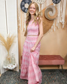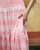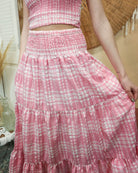 Layered charm meets summer style in this pink gingham maxi skirt. Tiered construction creates beautiful movement and dimension, while the classic pattern keeps things timeless. Flowy, feminine, and perfect for those endless sunny days ahead.