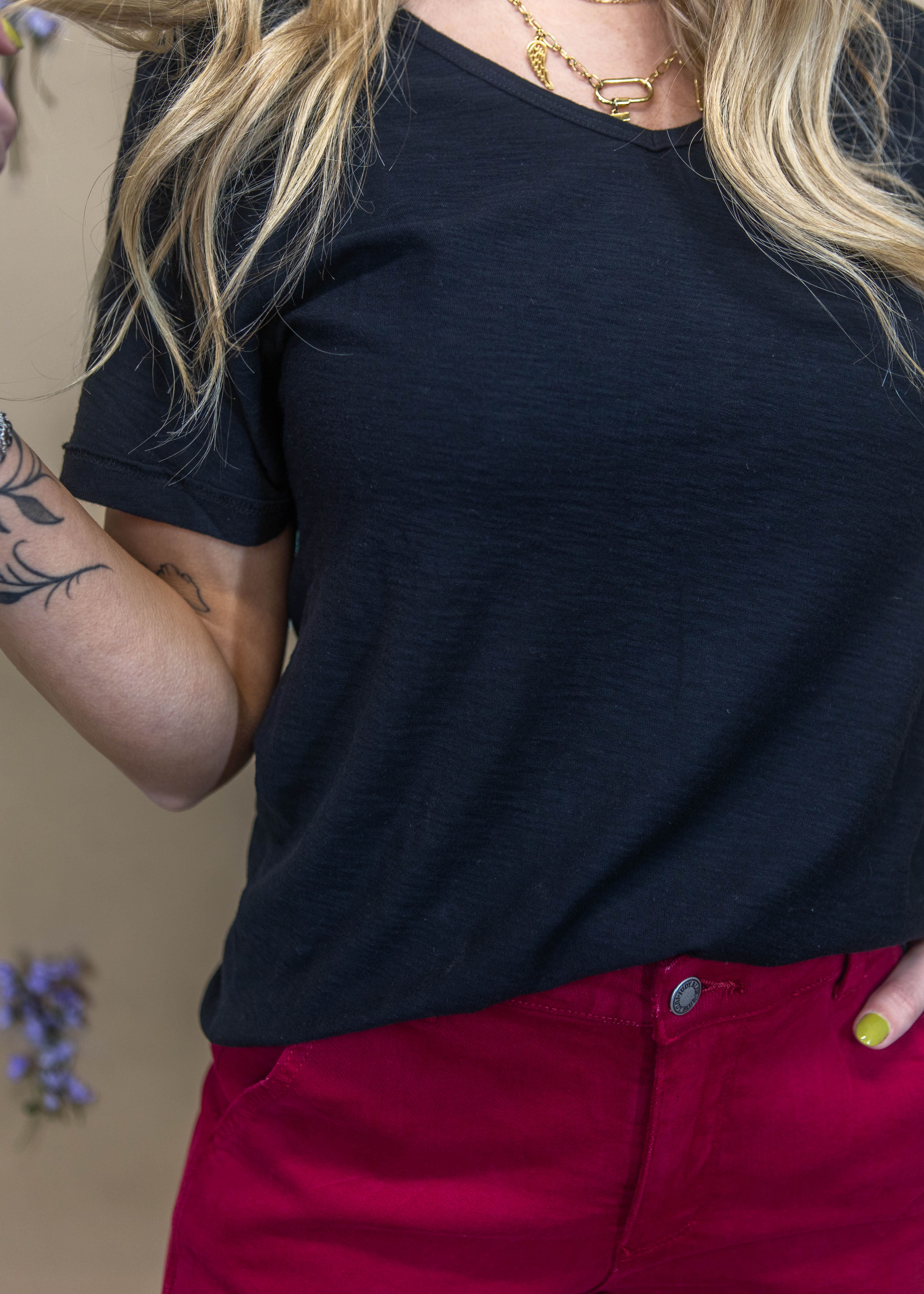 Unleash your inner cool with our Keep the Basics Tee in Black. This simple, yet versatile v-neck top is a must-have for any wardrobe. Don't miss out on this essential piece!