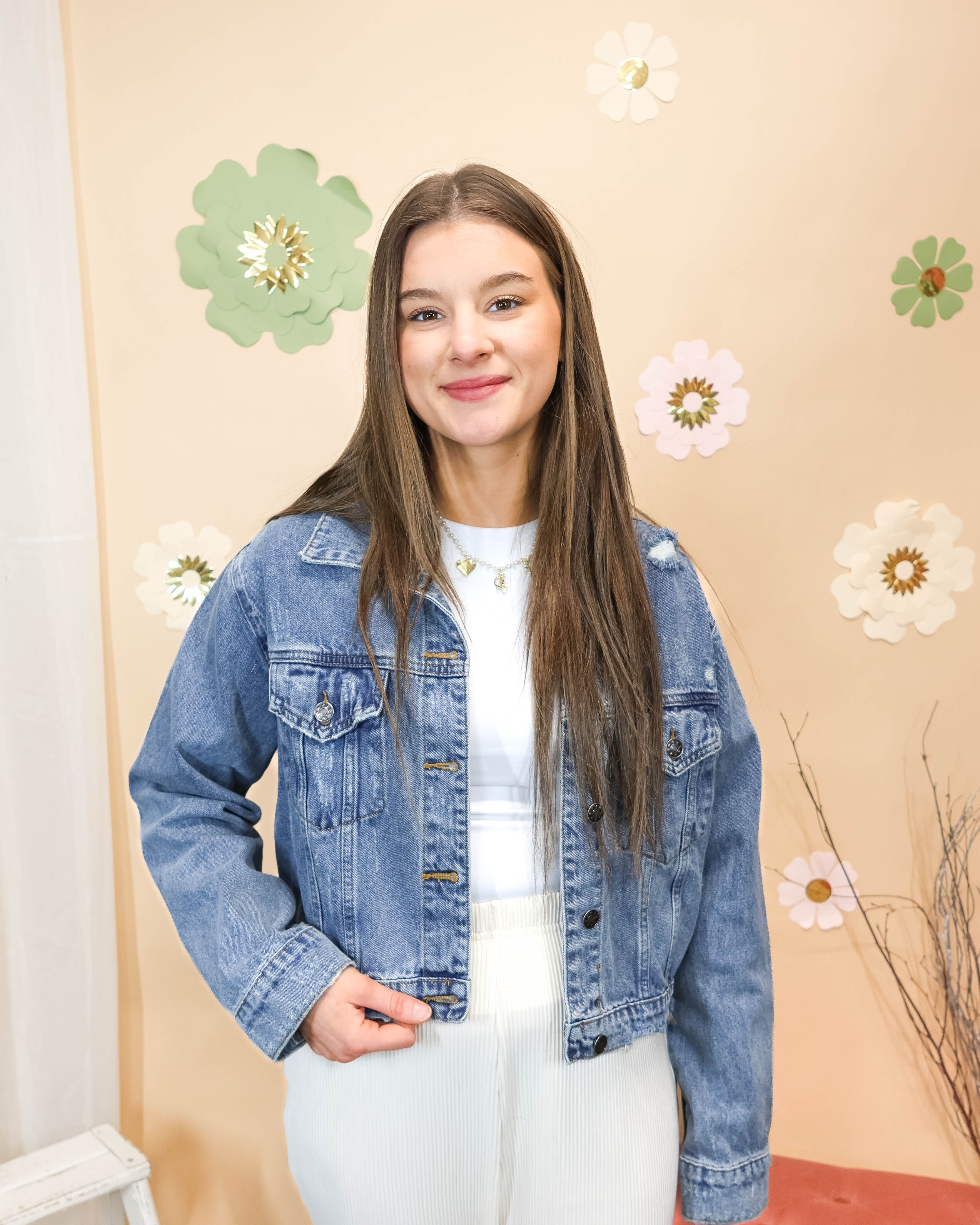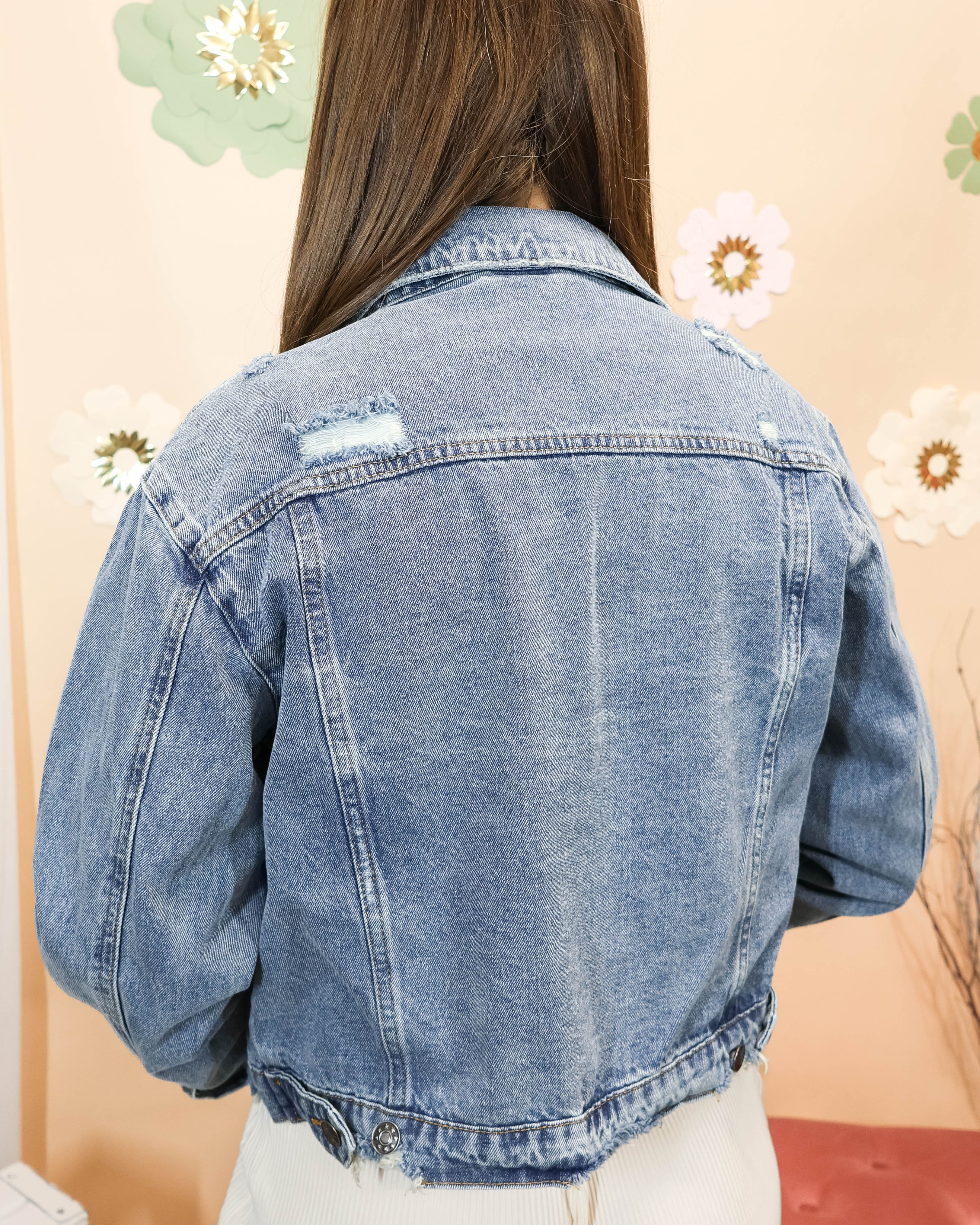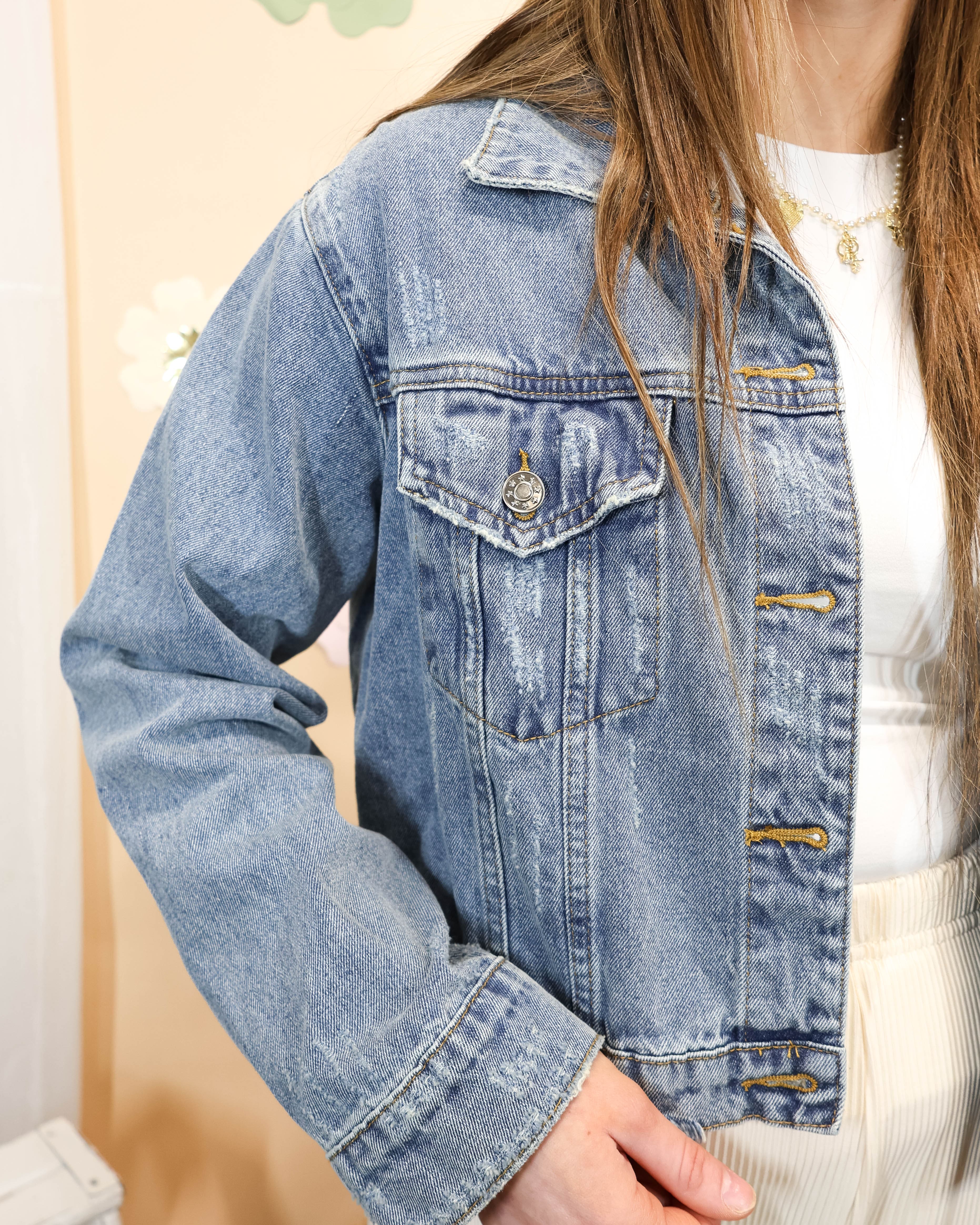 The Love In Every Layer Denim Jacket is your go-to layering piece with serious style. This shorter-fit jacket features a trendy medium wash and cool distressed details that give it character and edge. Perfect for throwing over dresses, tees, or anything in between, it's the ultimate versatile layer that works year-round. Classic denim with a modern twist—this jacket is ready for whatever you throw at it.