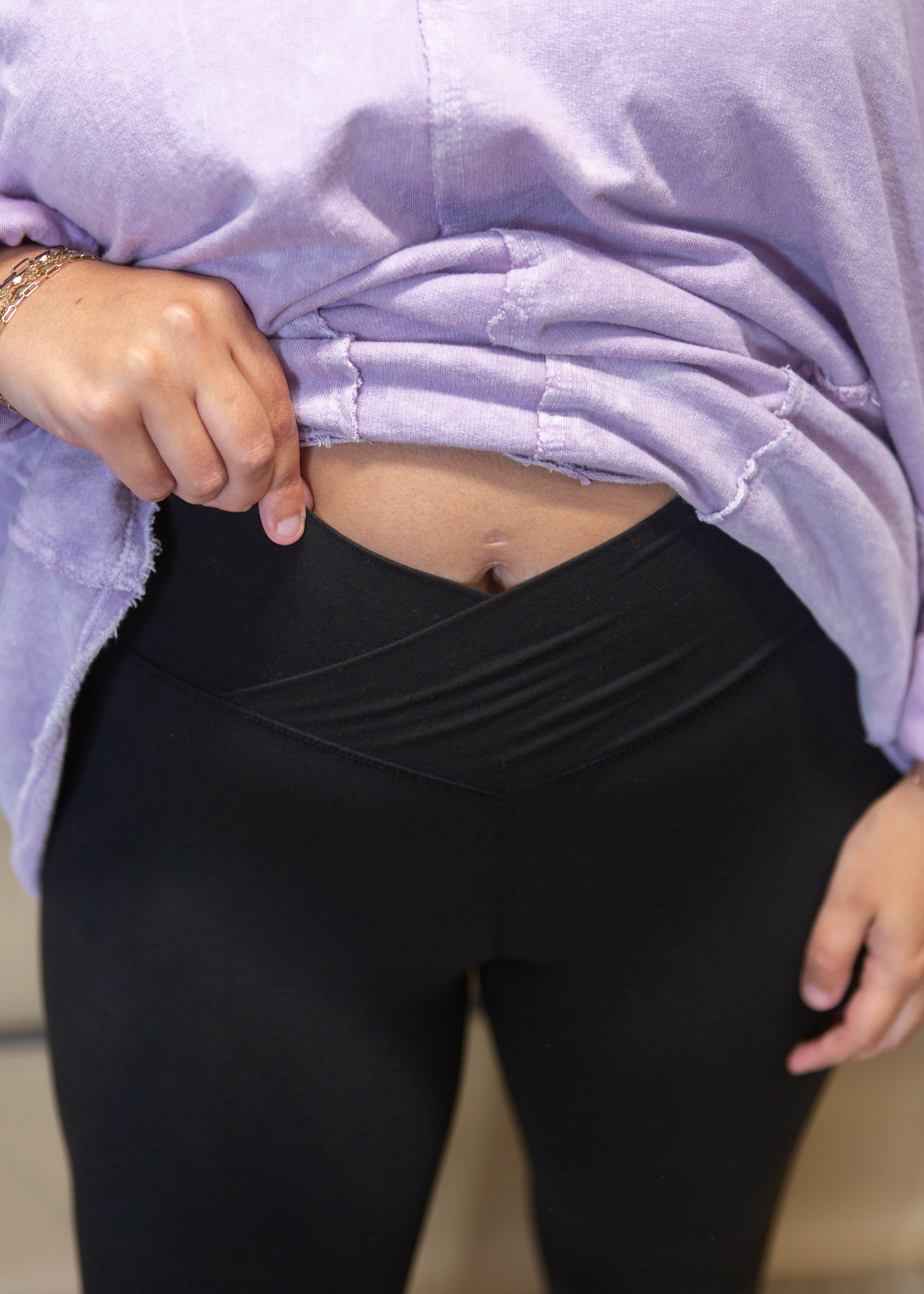 Skip, strut, and shimmy in style with our Cross On Over Legging! These black leggings feature a v cross over waistband and are guaranteed to keep you comfortable all day long. Say goodbye to boring basic leggings and hello to a fun and flattering twist on a classic!