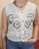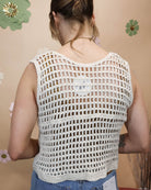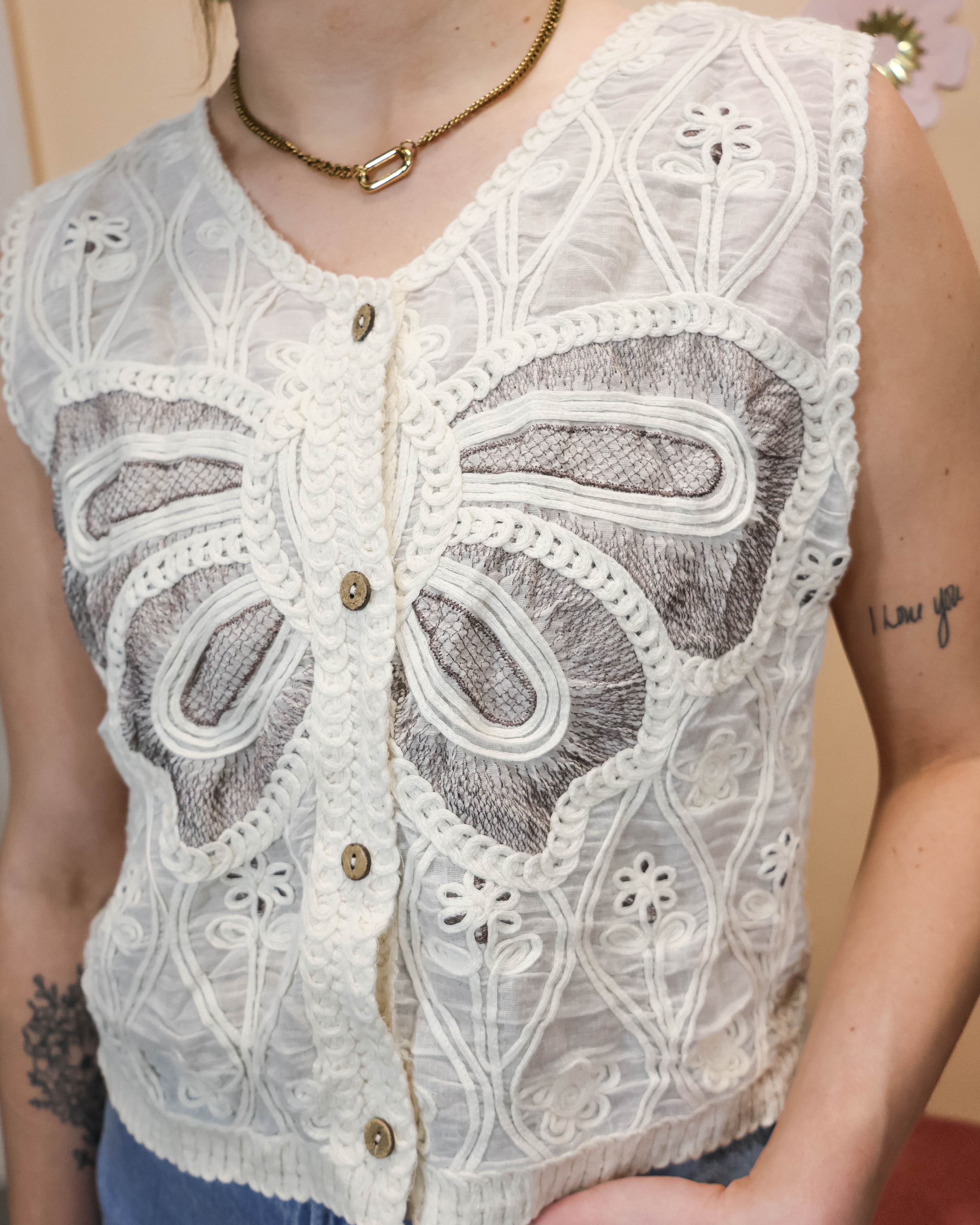 This lightweight summer essential features an intricate crochet back panel paired with delicate butterfly mesh accents for a romantic, textured look. Subtle button details add dimension and visual interest throughout. This top will be a hot topic any time you wear it
