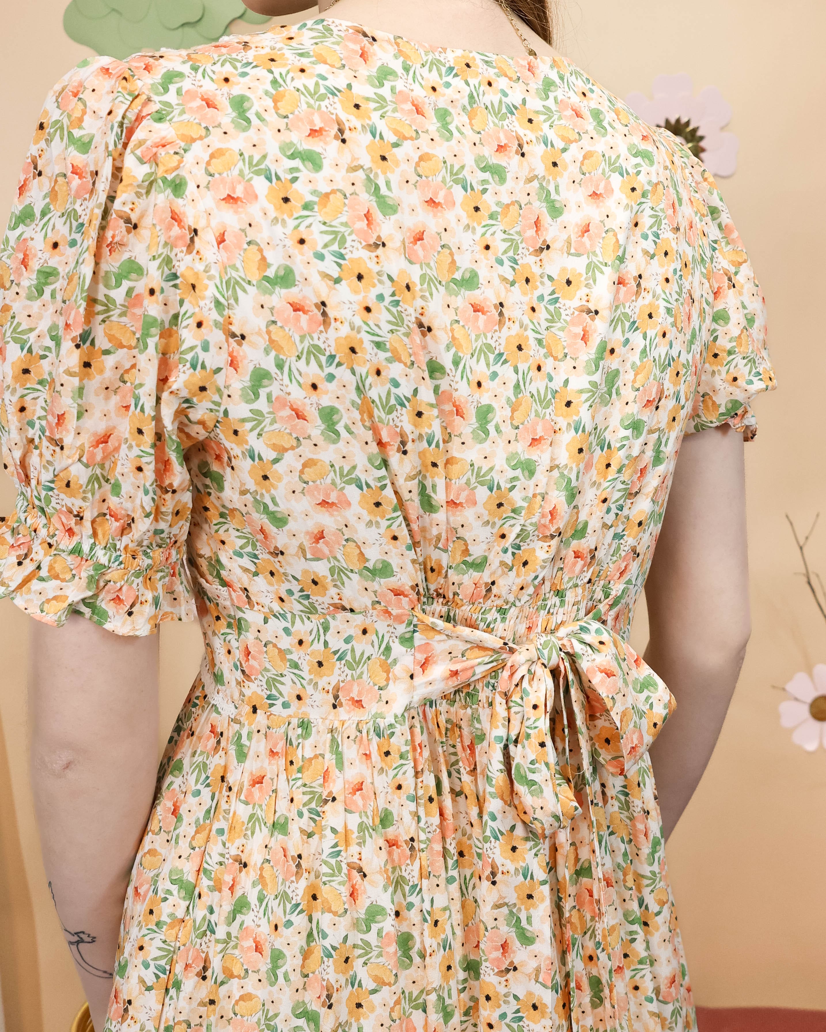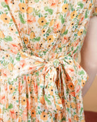 This beautiful off-white maxi features a delicate floral print with cheerful pops of color, charming bubble shoulders, and an adjustable tie waist that flatters your figure. The side zipper closure and stretch back ensure a comfy fit and make it easy to get on and off. Romantic, playful, and endlessly versatile.