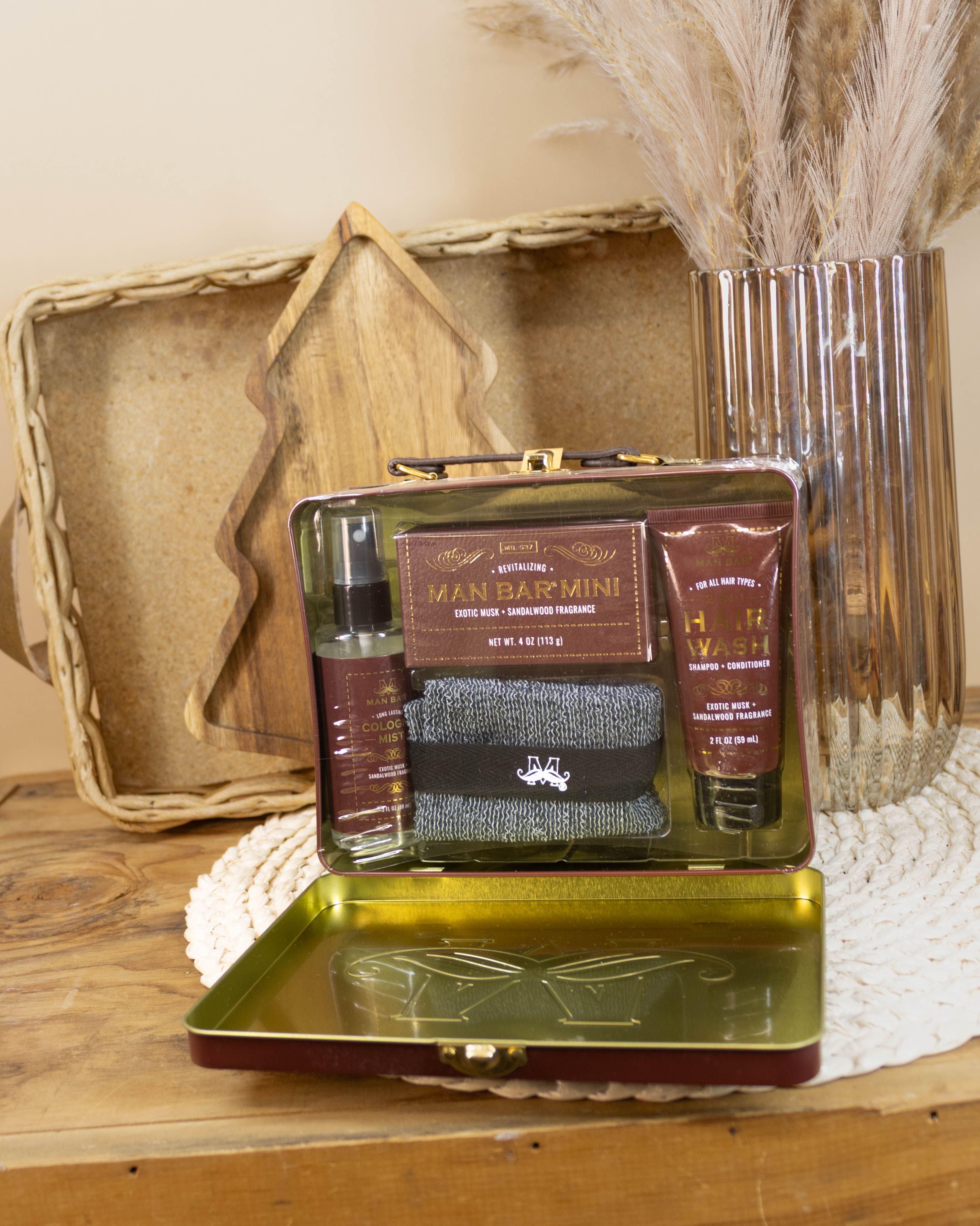Each Man Bar® Travel Kit includes four elevated grooming essentials, thoughtfully packed in a reusable tin with a leather-style handle: