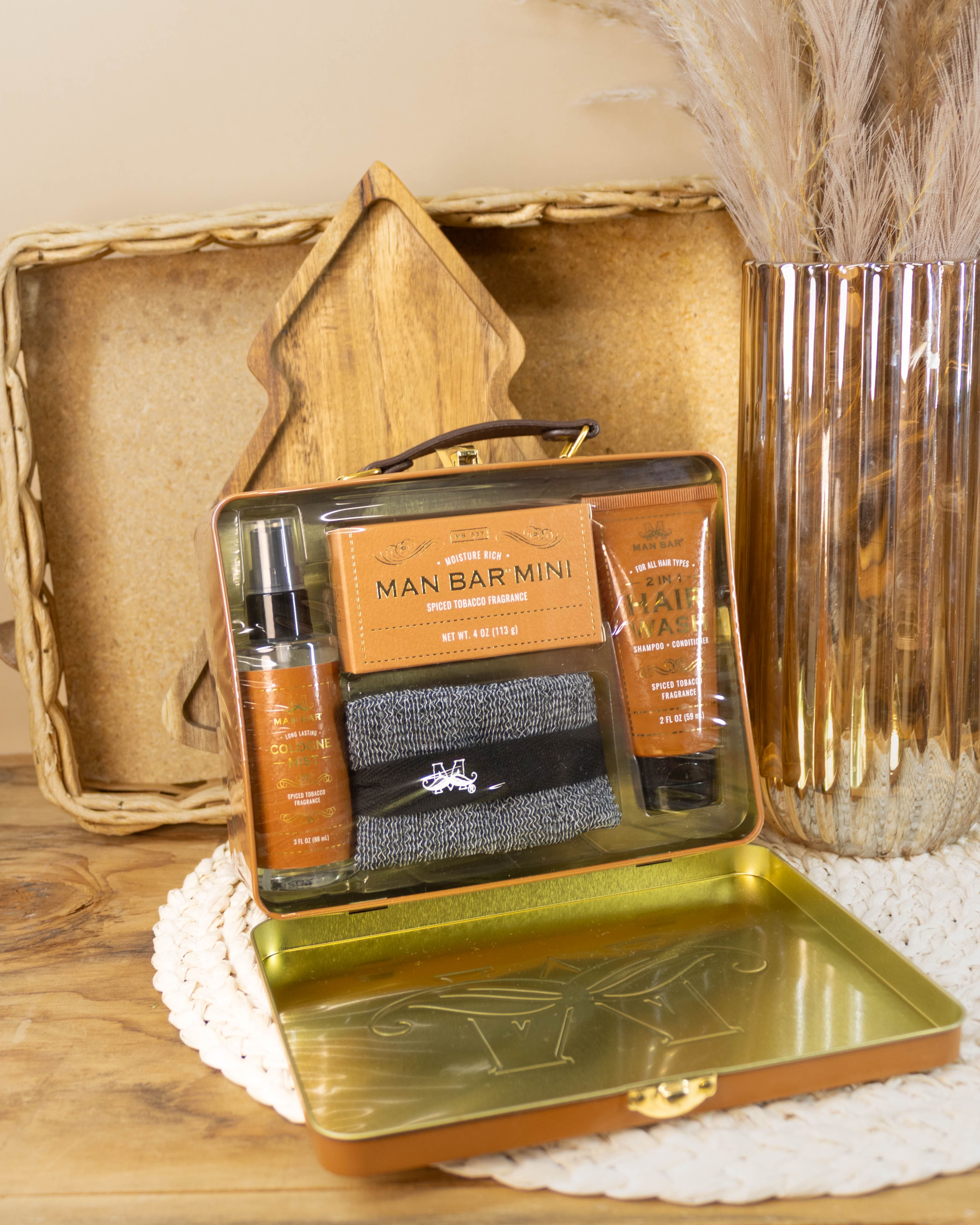 Each Man Bar® Travel Kit includes four elevated grooming essentials, thoughtfully packed in a reusable tin with a leather-style handle: