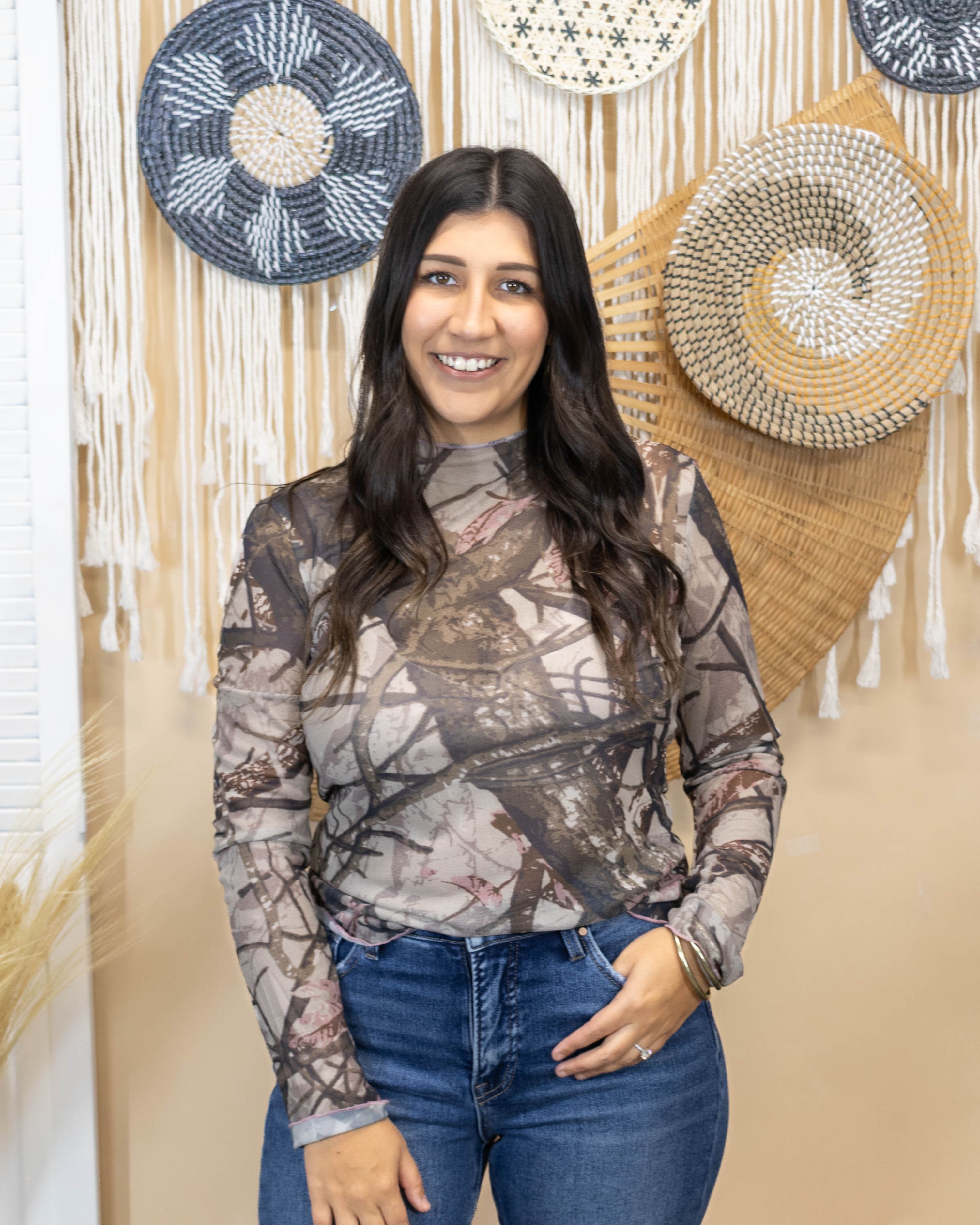 Elevate your style with this striking camo mesh top, where bold pink accents weave throughout the design for an edgy, eye-catching look. The breathable mesh fabric keeps you cool while the camouflage pattern mixed with vibrant pink creates an effortlessly trendy vibe that stands out. Perfect for layering or wearing solo, this piece transforms any outfit into a fashion statement that demands attention.