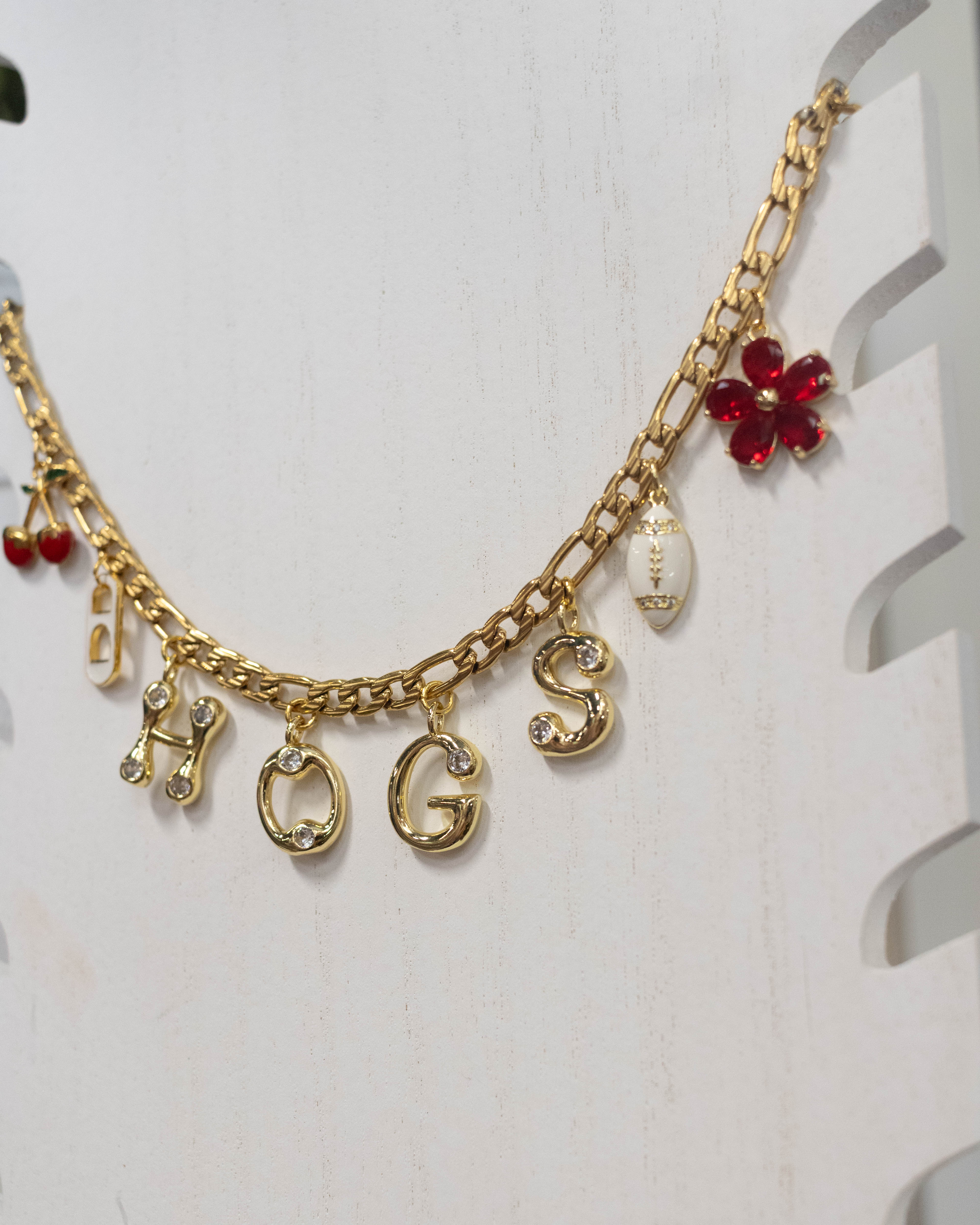 Celebrate Razorback spirit with the custom, one-of-a-kind Dainty Hogs Charm Necklace. Designed and assembled by Emily, this delicate piece combines subtle elegance with game day readiness. Its refined style lets you show your team pride gracefully, making it the perfect accessory for devoted fans who appreciate both charm and fandom.
