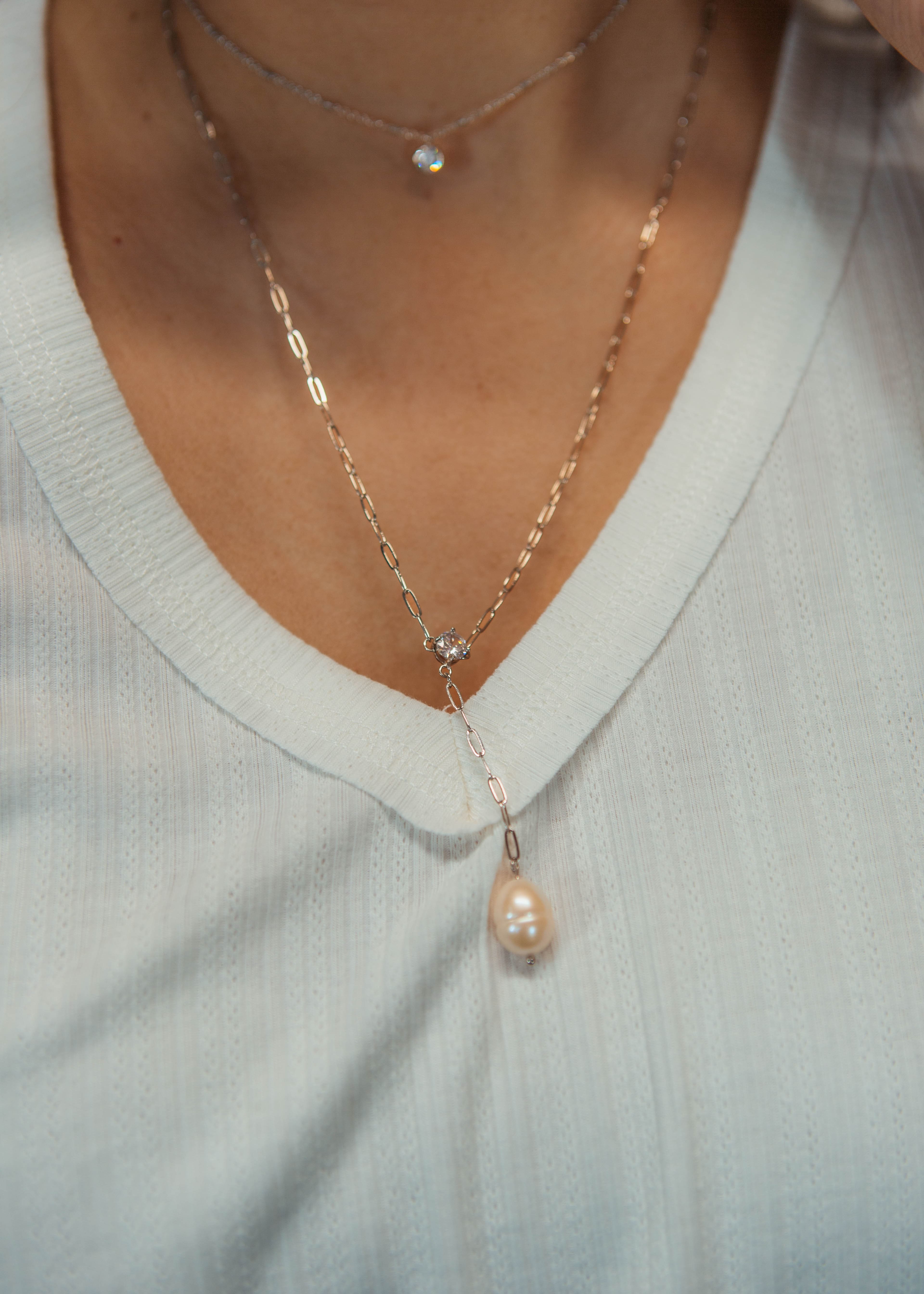 Add a touch of whimsy to your look with the Jasmine Necklace-Silver. This playful piece features a layered silver chain with a unique pearl bead detail on the bottom. Perfect for effortlessly elevating any outfit, this necklace is sure to become a staple in your jewelry collection.