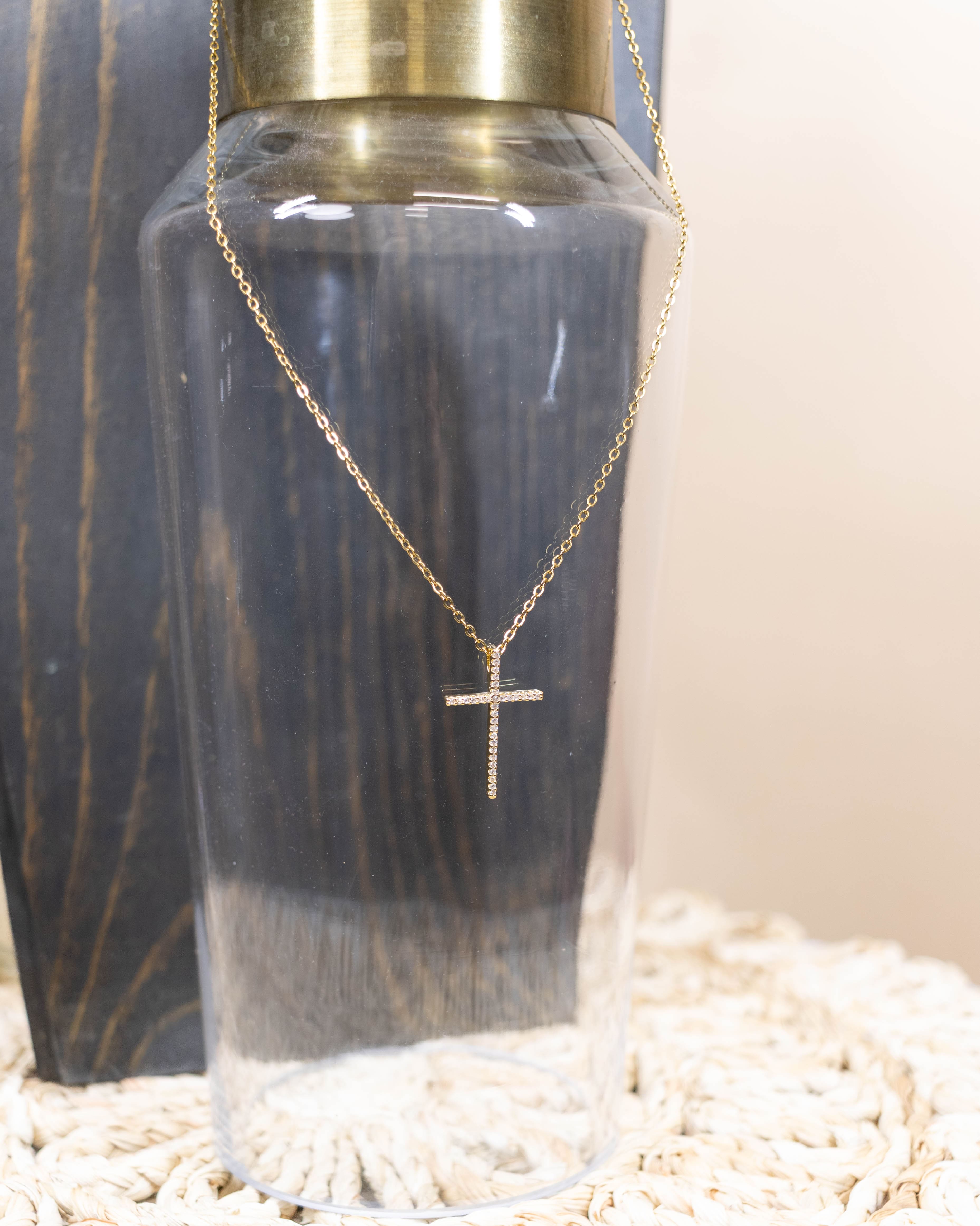 Elevate your everyday style with this stunning gold cross necklace, where timeless spirituality meets modern elegance. Adorned with shimmering rhinestones that catch the light beautifully, this piece makes a bold statement whether worn as a personal faith symbol or a fashionable accessory. The lustrous gold finish complements any skin tone and pairs effortlessly with casual or formal outfits. Perfect for layering or wearing solo, this necklace becomes an instant conversation starter. Invest in a piece that combines meaningful symbolism with undeniable sparkle—a versatile treasure you'll reach for again and again.